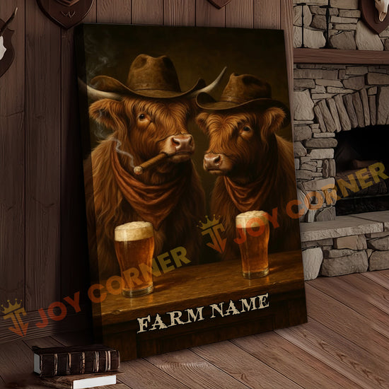 Joycorner Highland Cow Cowboy Beer Bar – Personalized Farm Name 3D Wrapped Canvas