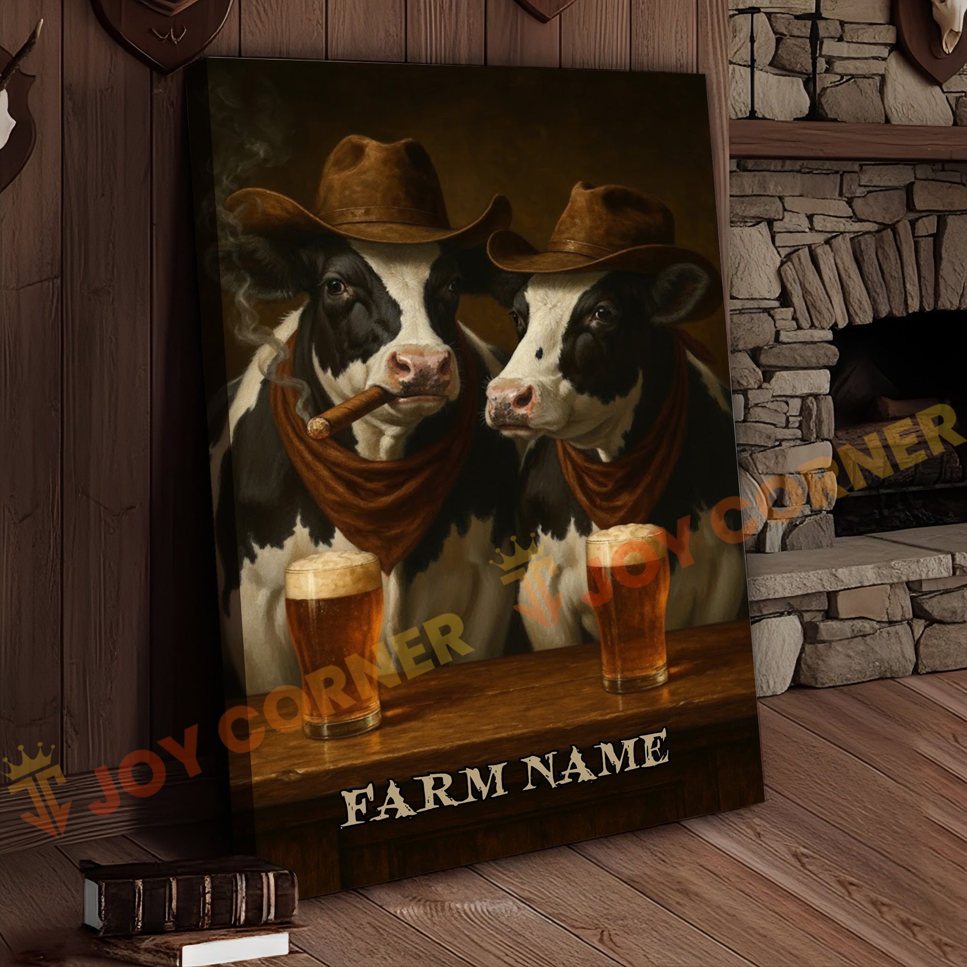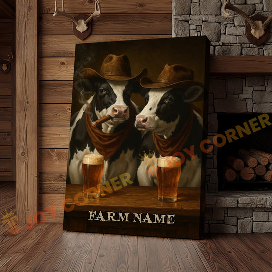 Joycorner Holstein Cow Duo Cowboy Beer Bar – Personalized Farm Name 3D Wrapped Canvas