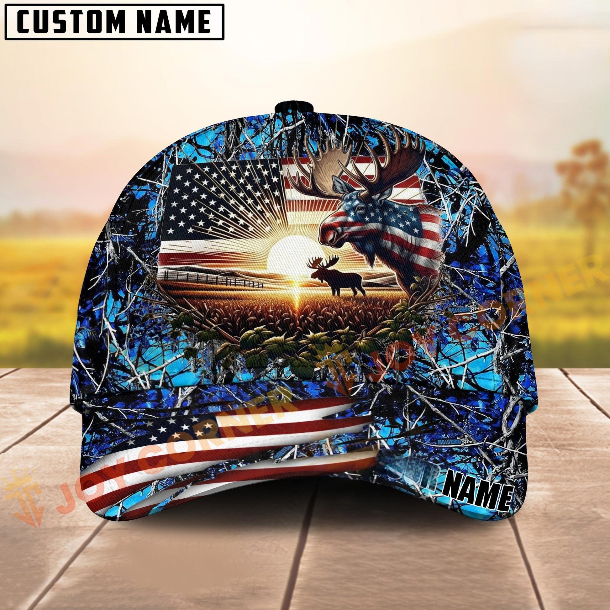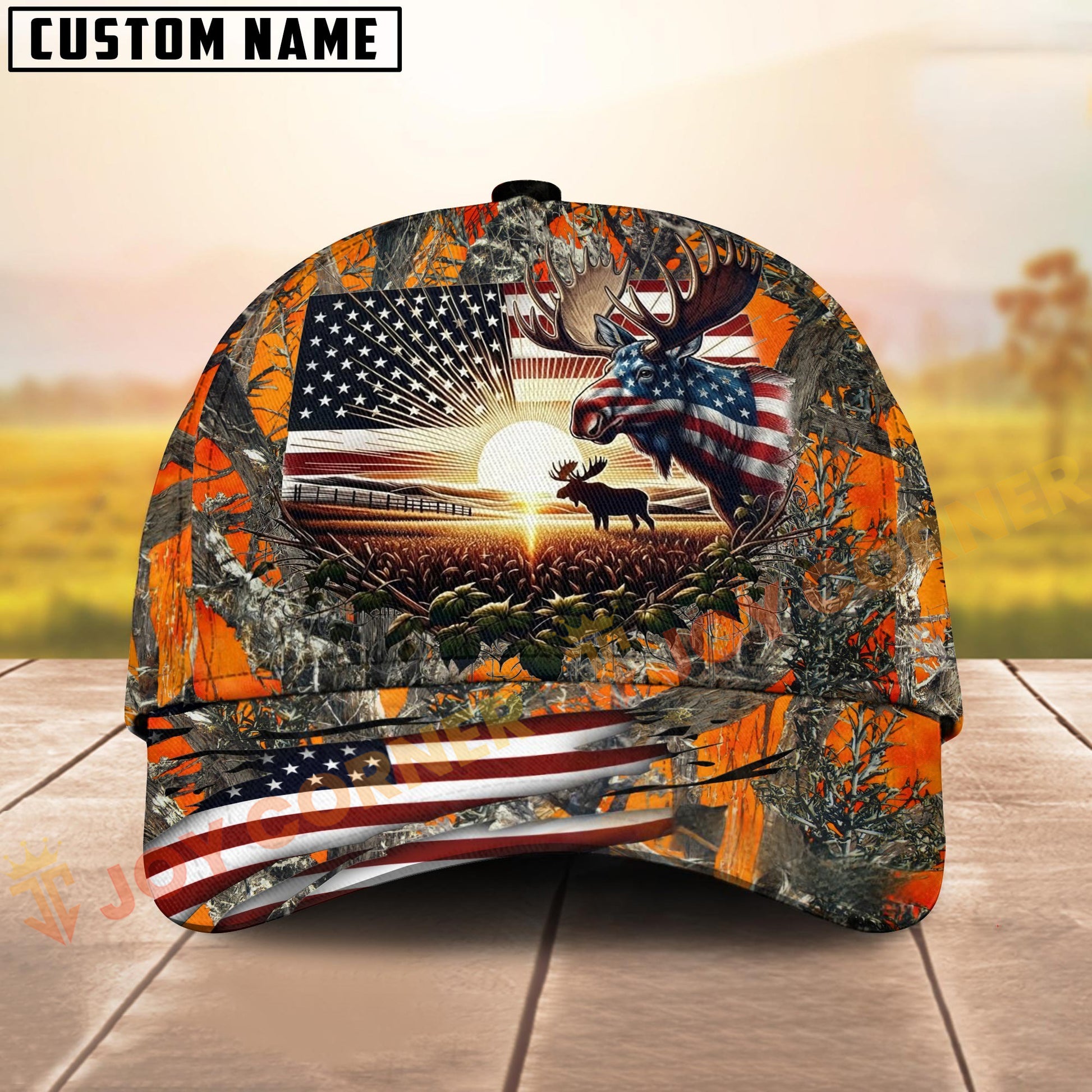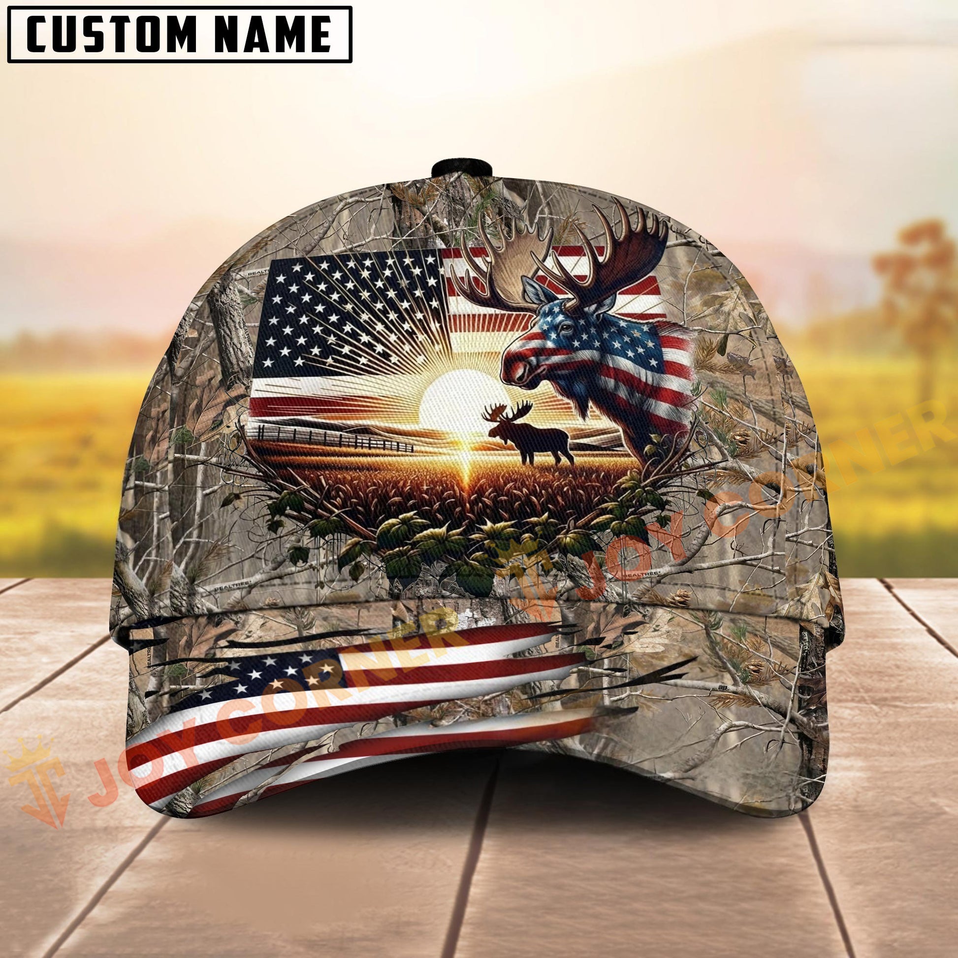 Joycorners Hunting American Flag Moose Sunrise Farm Scene Camo Custom Name 3D Cap (6 Colors)