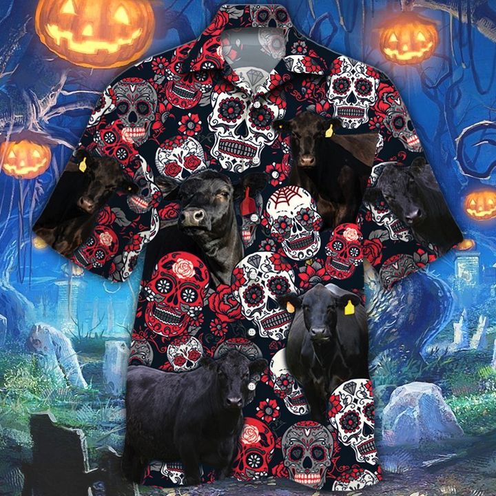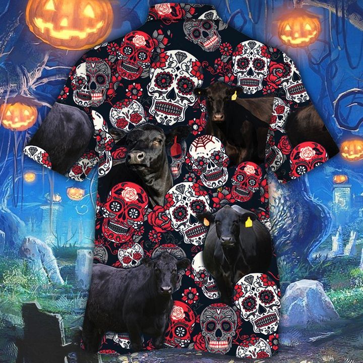 Joycorners Black Angus Cattle Lovers Sugar Skull Floral Hawaiian Shirt