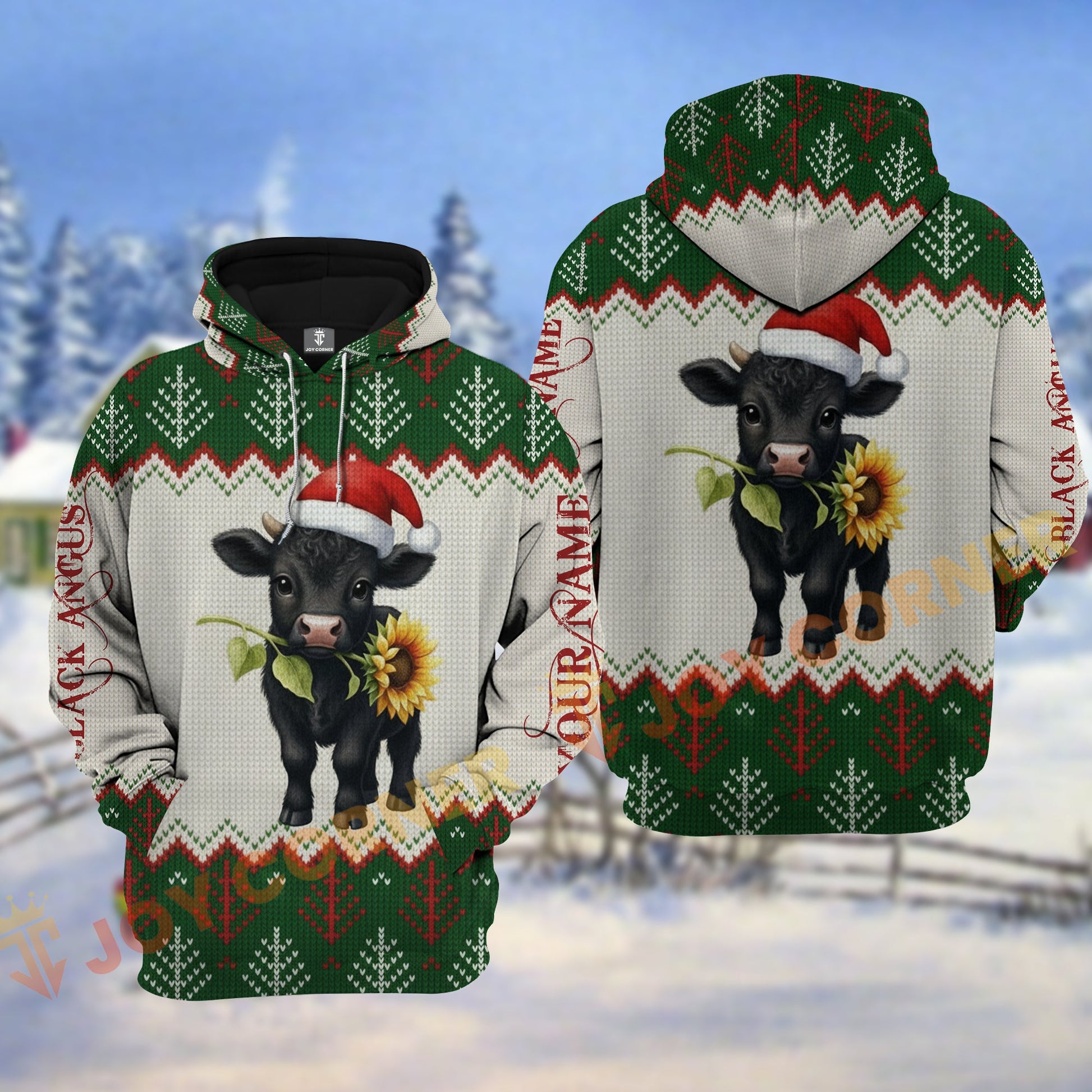 Joycorners Black Angus Cow Christmas Hoodie Personalized Name 3D Shirt