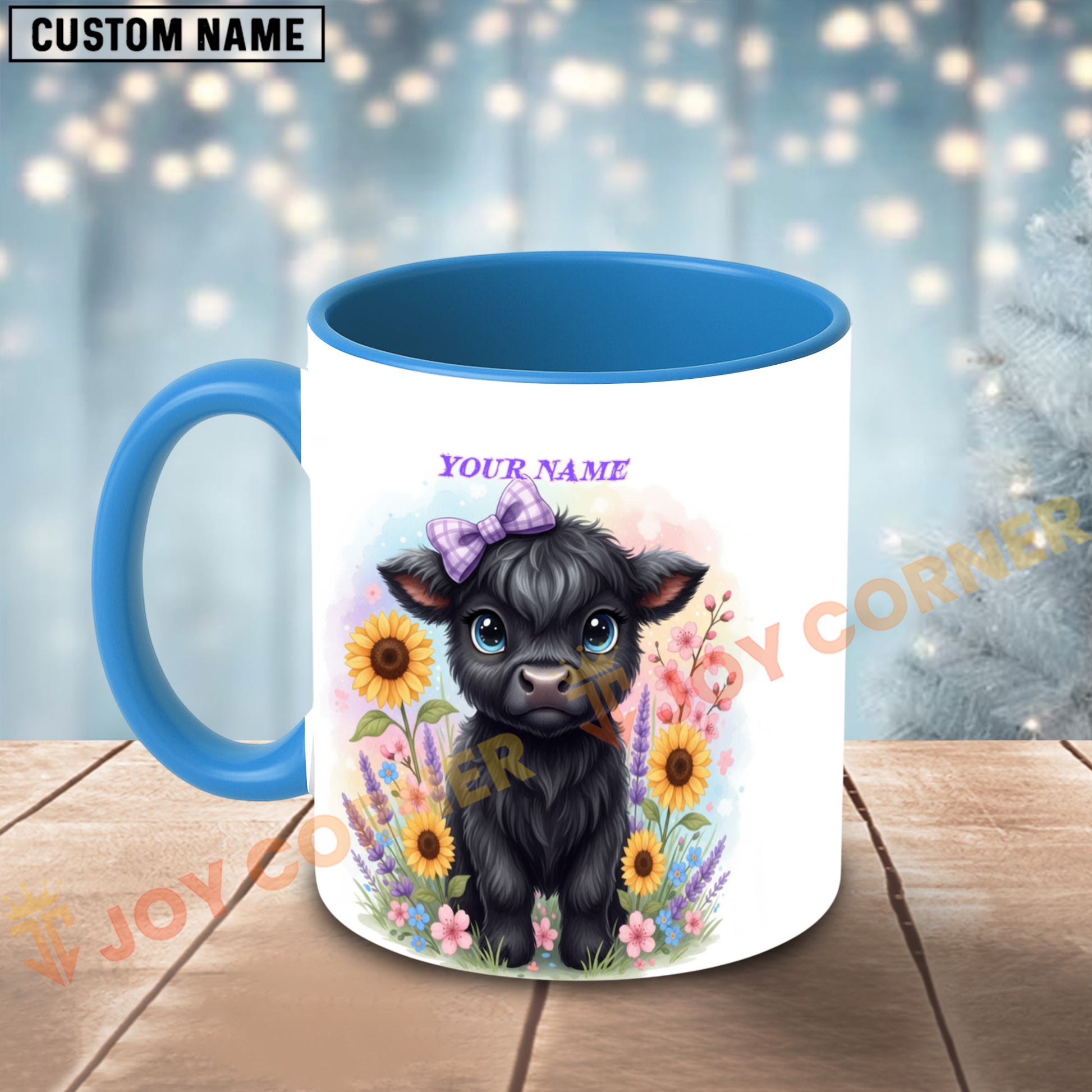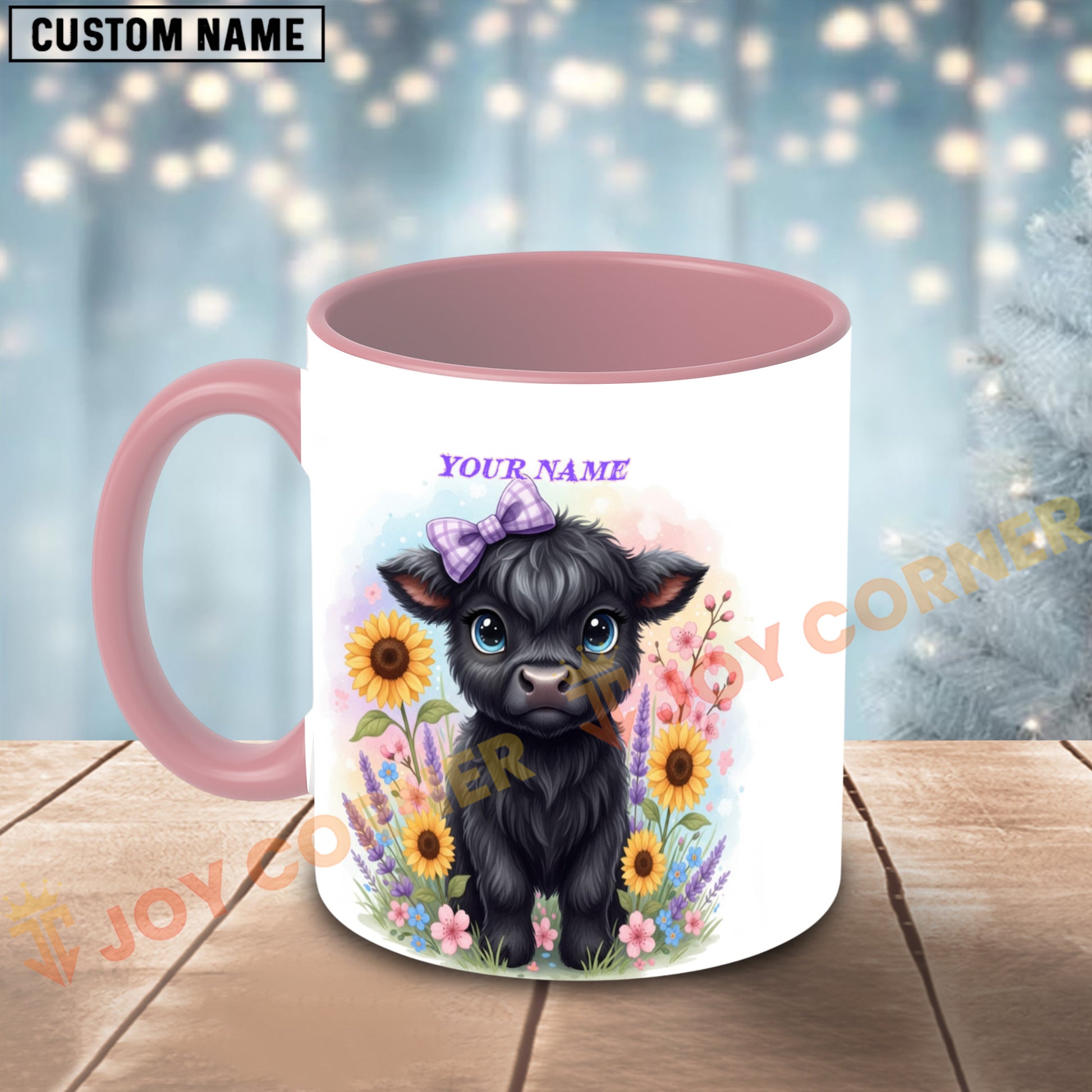 Joycorners Black Angus Cow Purple Bow Sunflower Custom Name Mug