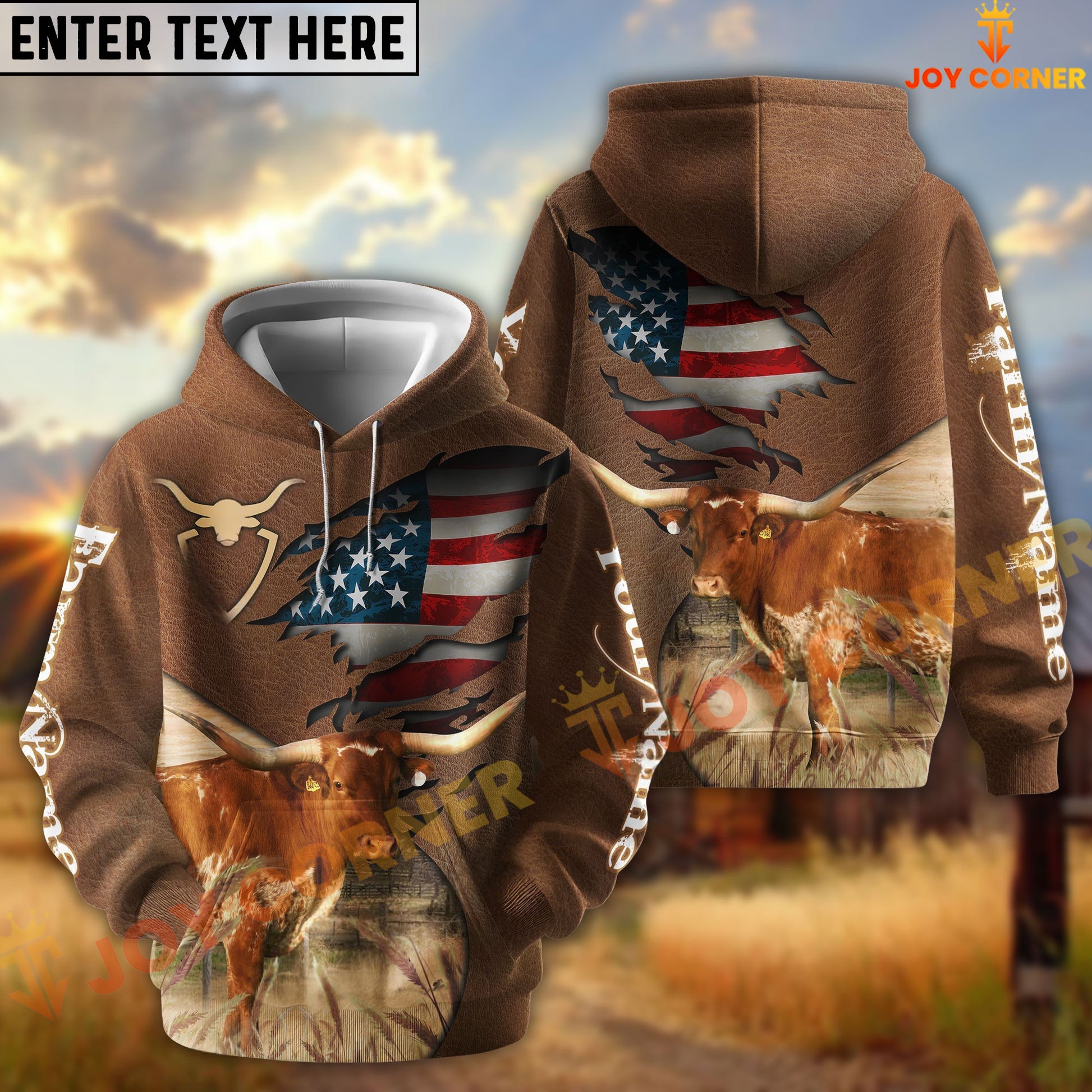 Joycorners American Flag Leather Pattern Texas Longhorn Cattle Personalized Name And Farm Name 3D Hoodie
