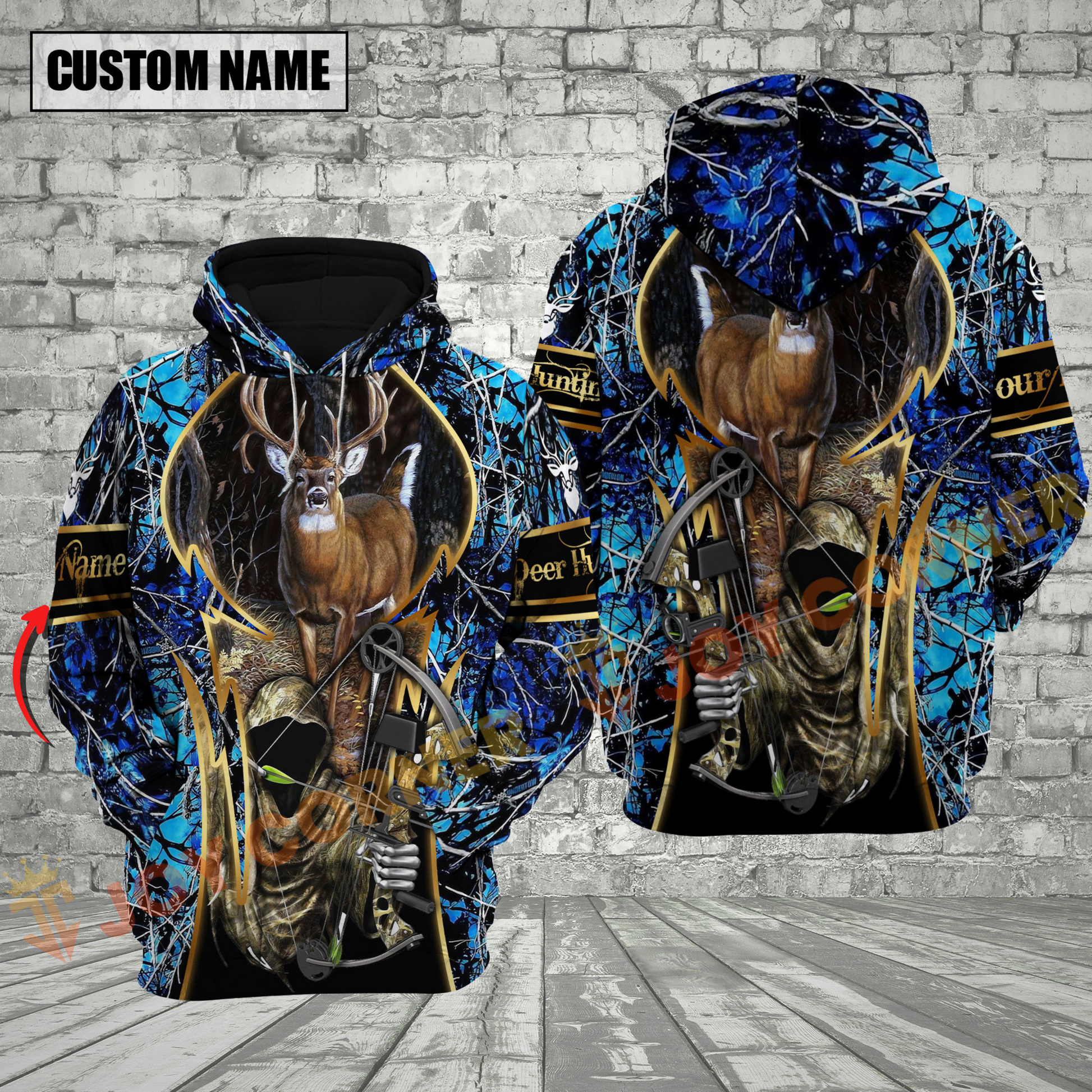 Joycorners Blue Camo Deer Hunting Custom Name Hunter Apparel With Grim Reaper Design 3D Hoodie All Over Printed Clothes