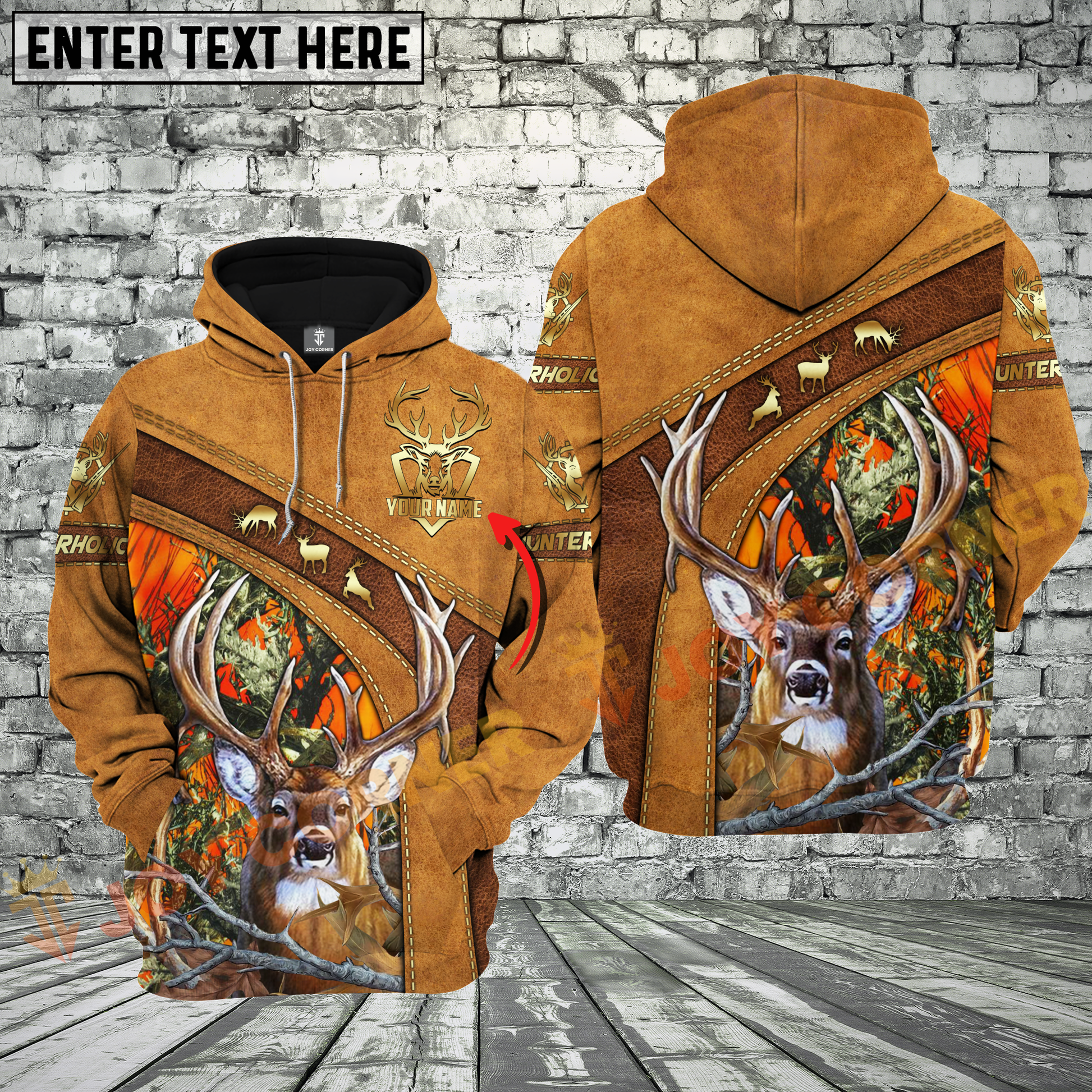 Joycorners Brown Leather Style Deer Hunting Custom Name Buck Hunter Apparel With Orange Camo 3D Hoodie All Over Printed Clothes
