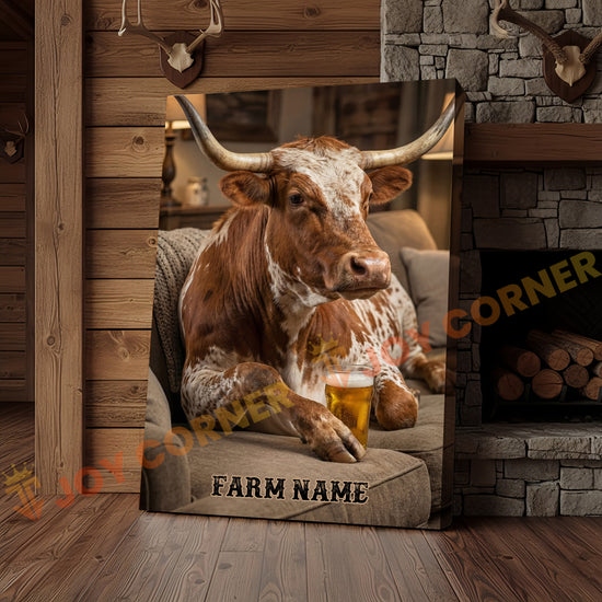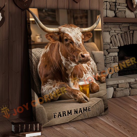 Joycorners Cattle Cow Cozy Farmhouse Texas Longhorn Cow Relaxing On Sofa Personalized Name Canvas