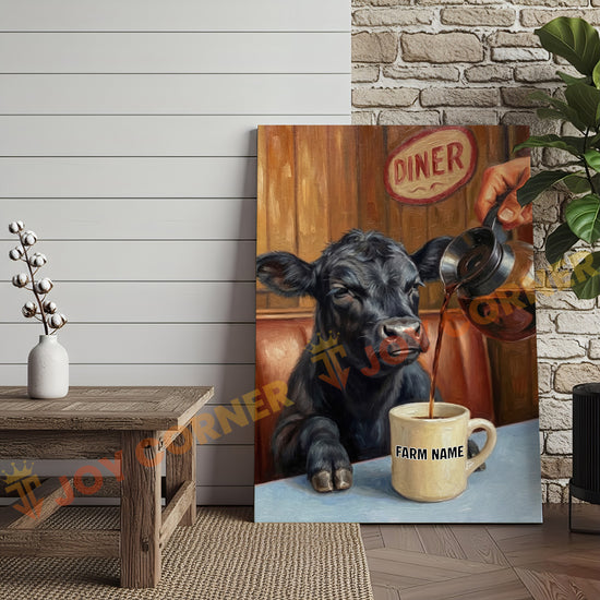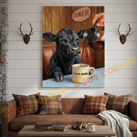 Joycorners Cattle Cow Funny Black Angus Cow Drinking Coffee In Diner Personalized Name Canvas
