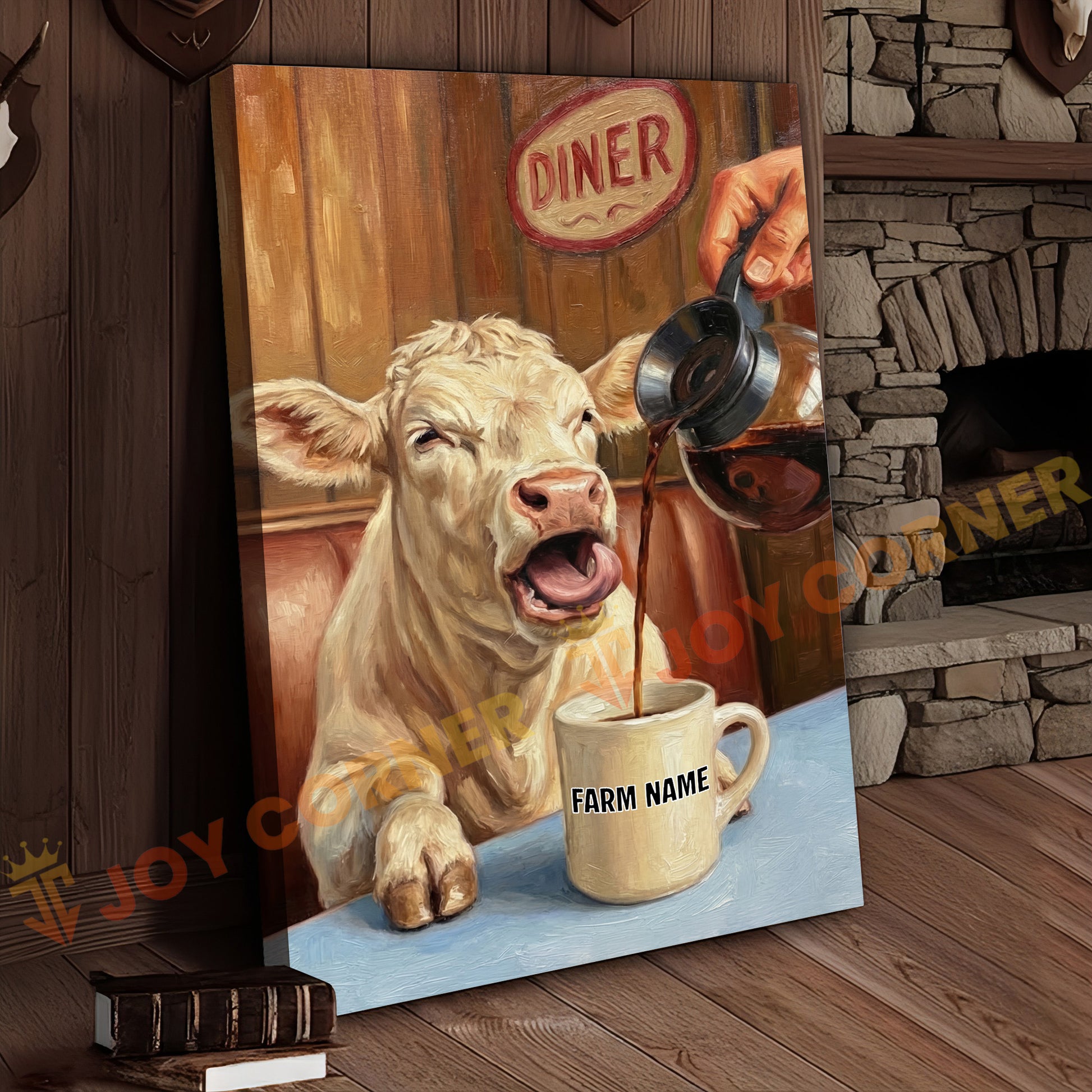 Joycorners Cattle Cow Funny Charolais Cow Drinking Coffee In Diner Personalized Name Canvas
