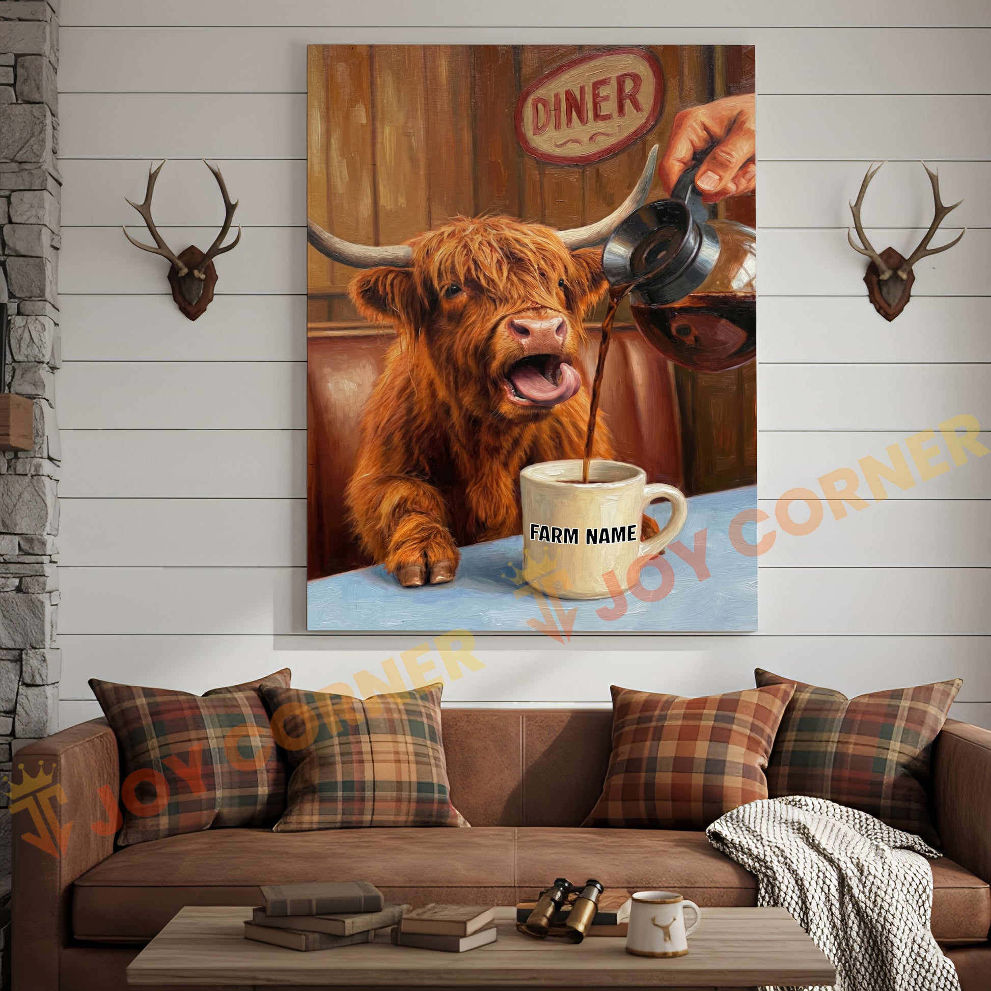 Joycorners Cattle Cow Funny Highland Cow Drinking Coffee In Diner Personalized Name Canvas