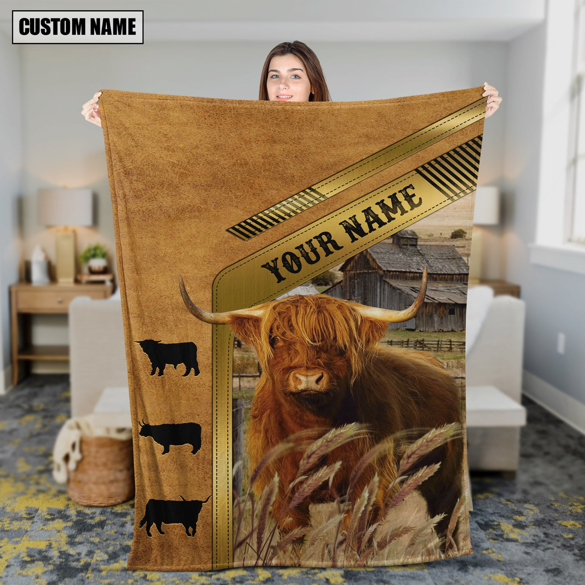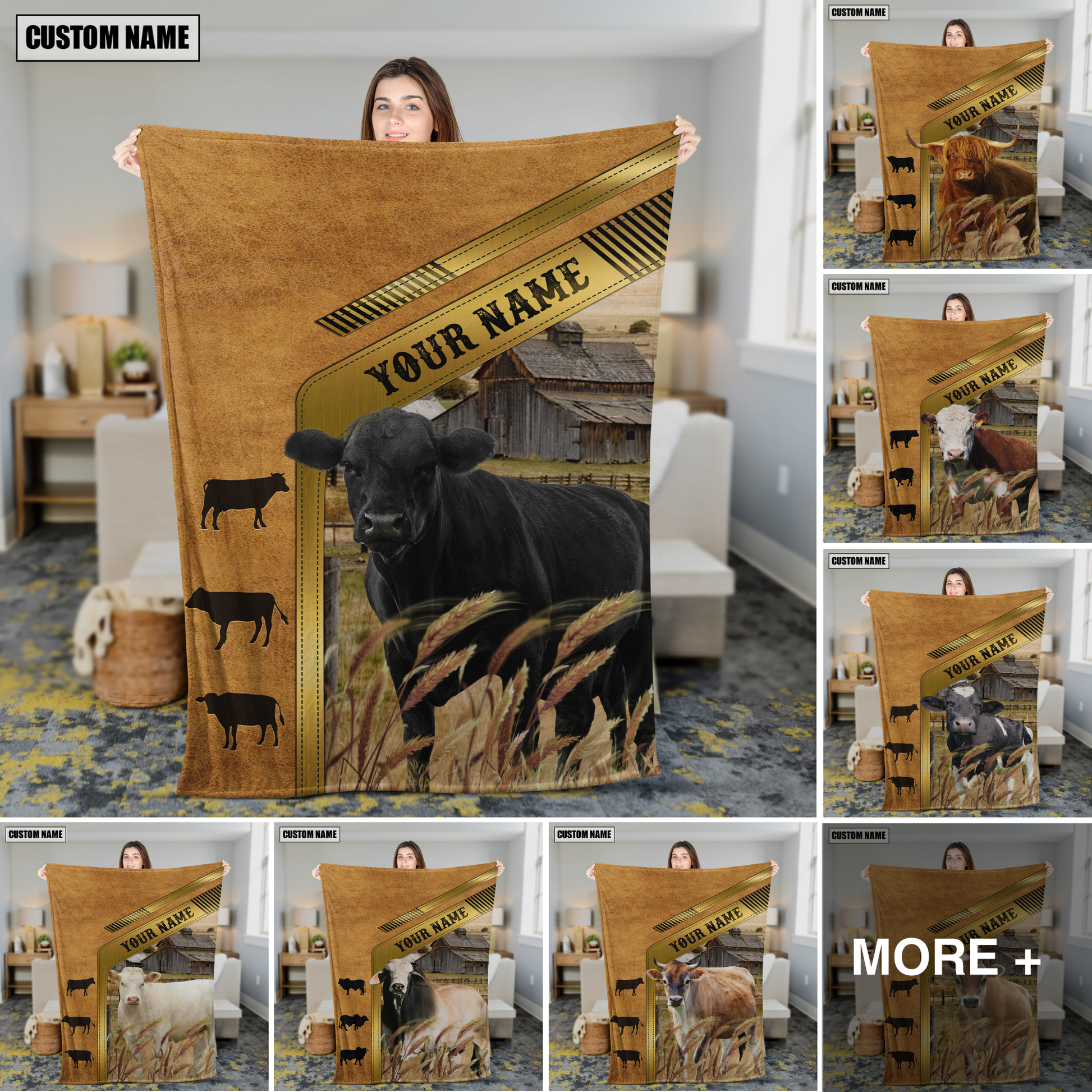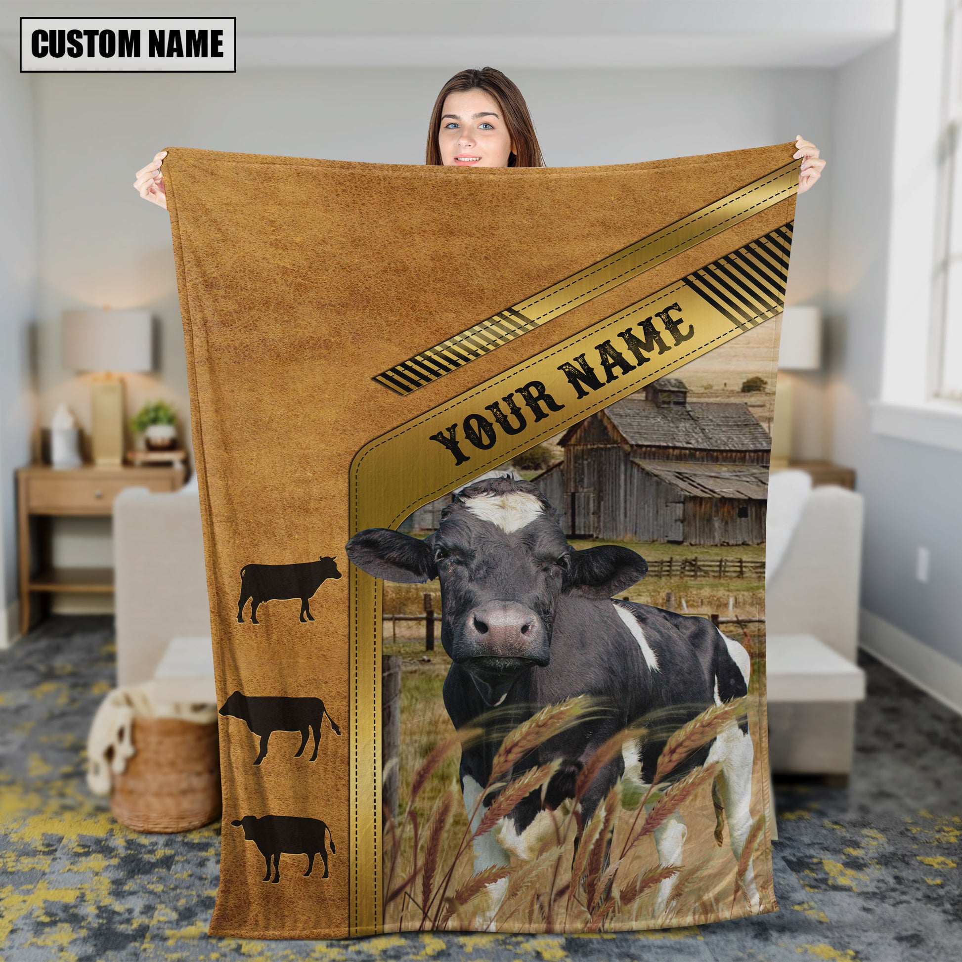 Joycorners Cattle Cow Leather Patch Rustic Farm Pattern Personalized Name 3D Blanket (10 Breeds)