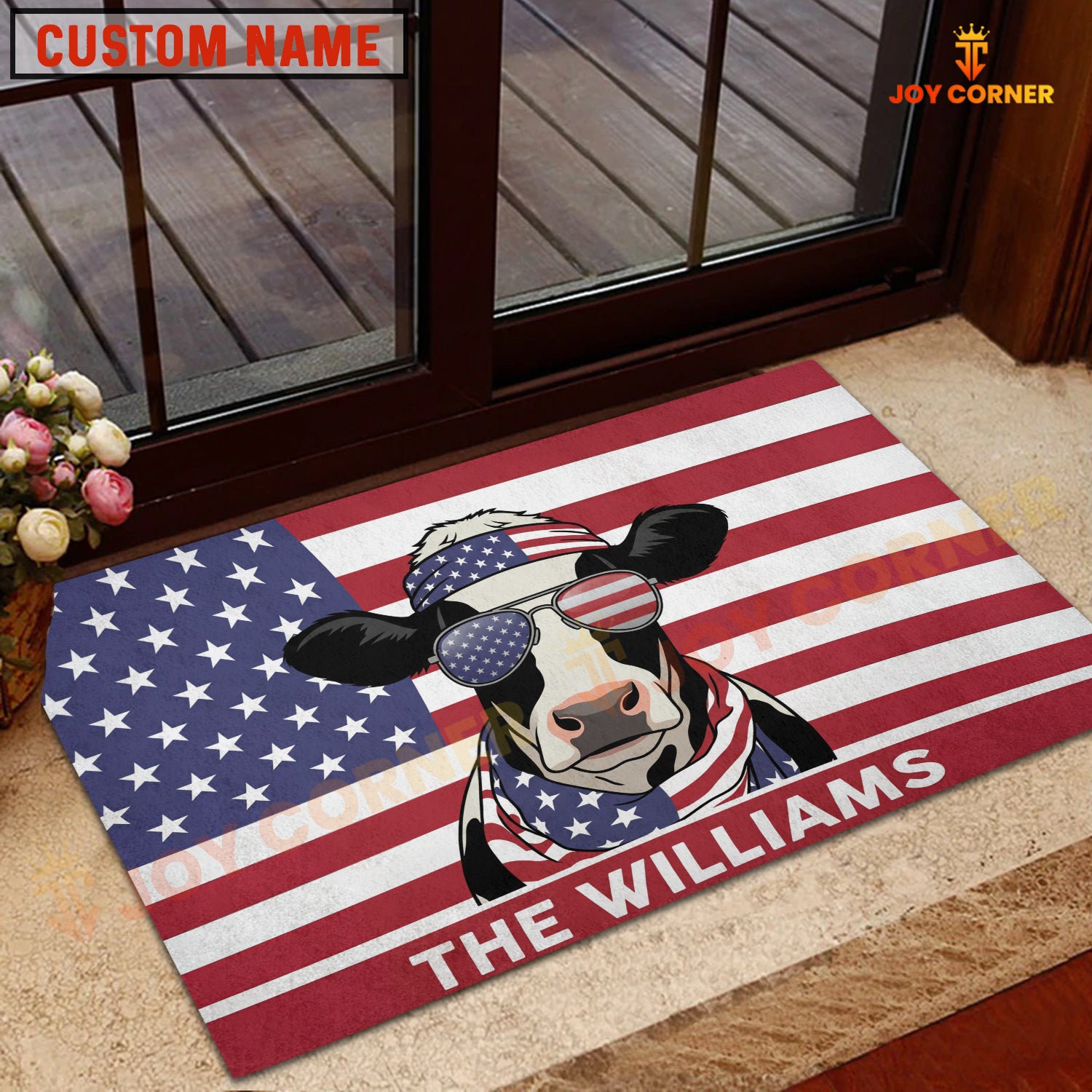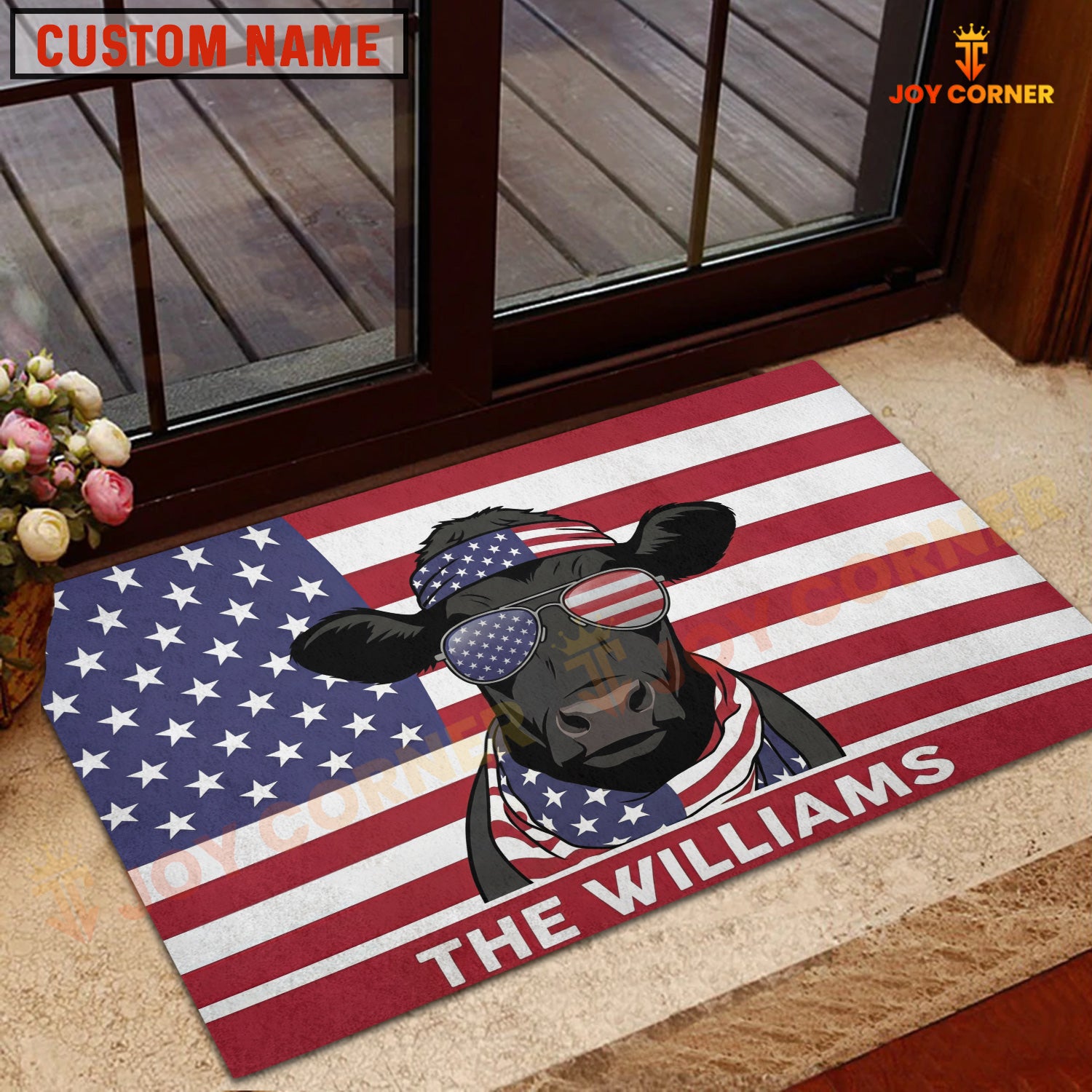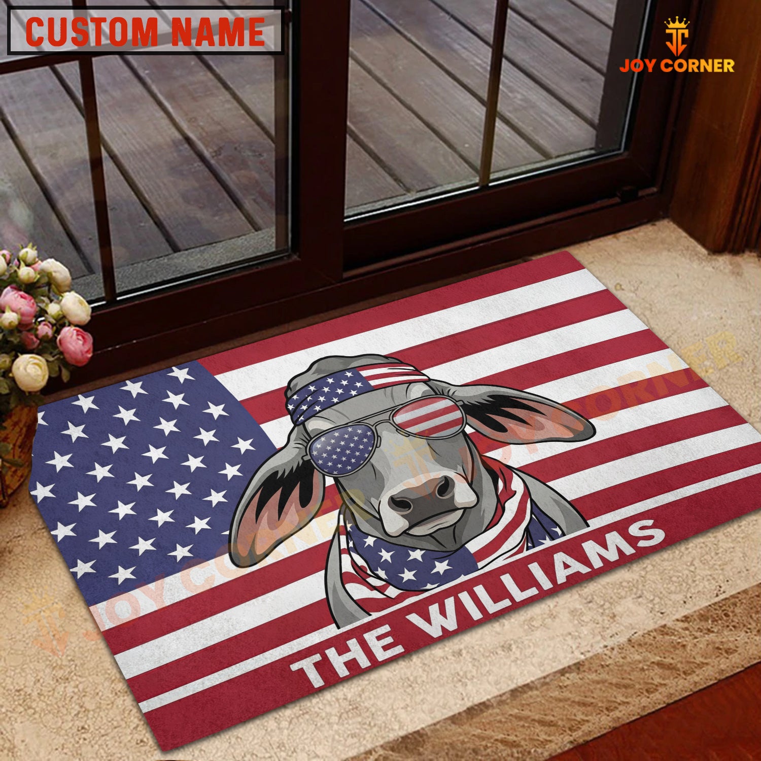 Joycorners Cool Cow Wearing USA Flag Bandana and Sunglasses Patriotic Personalized Name 3D Doormat (8 Breeds)