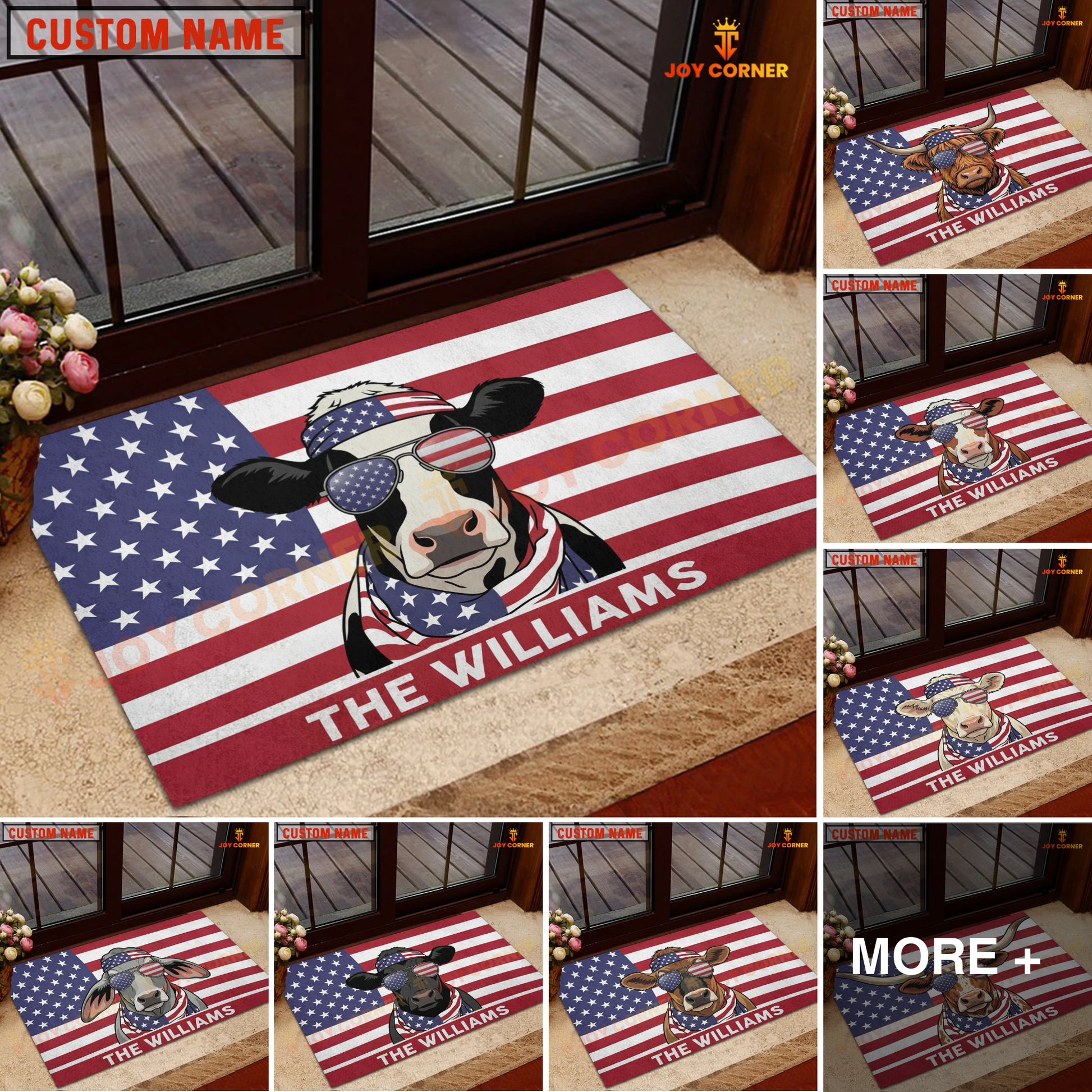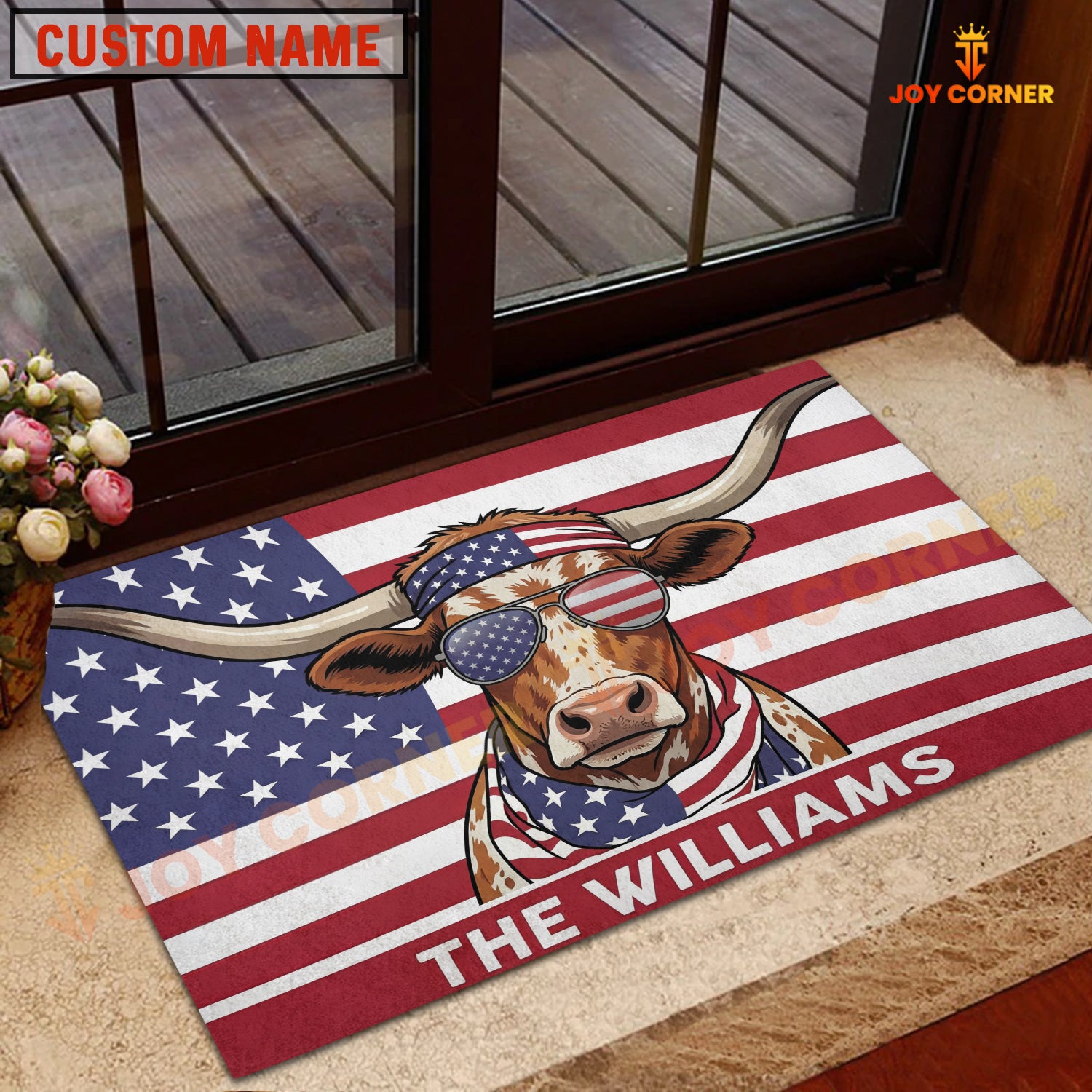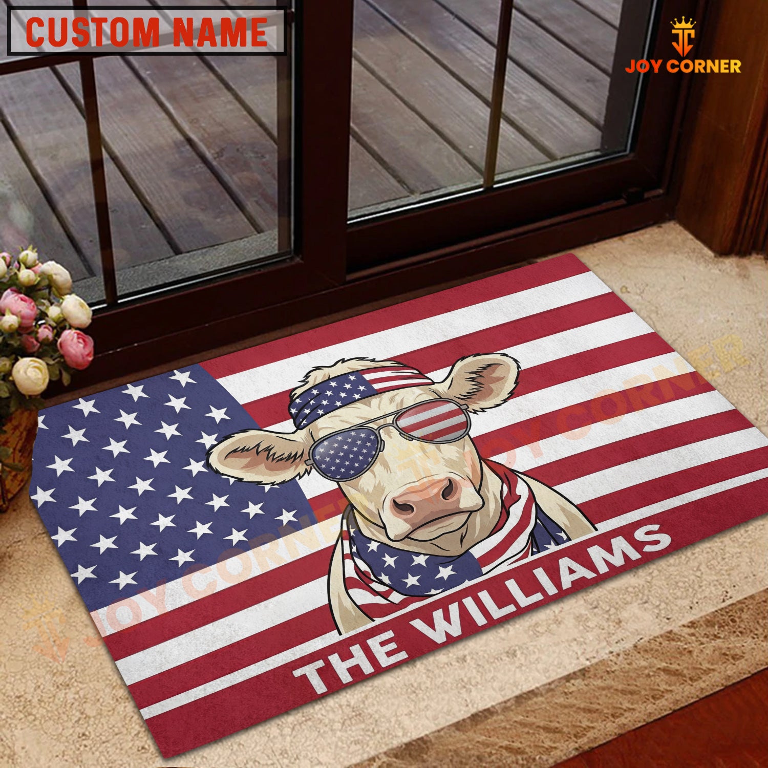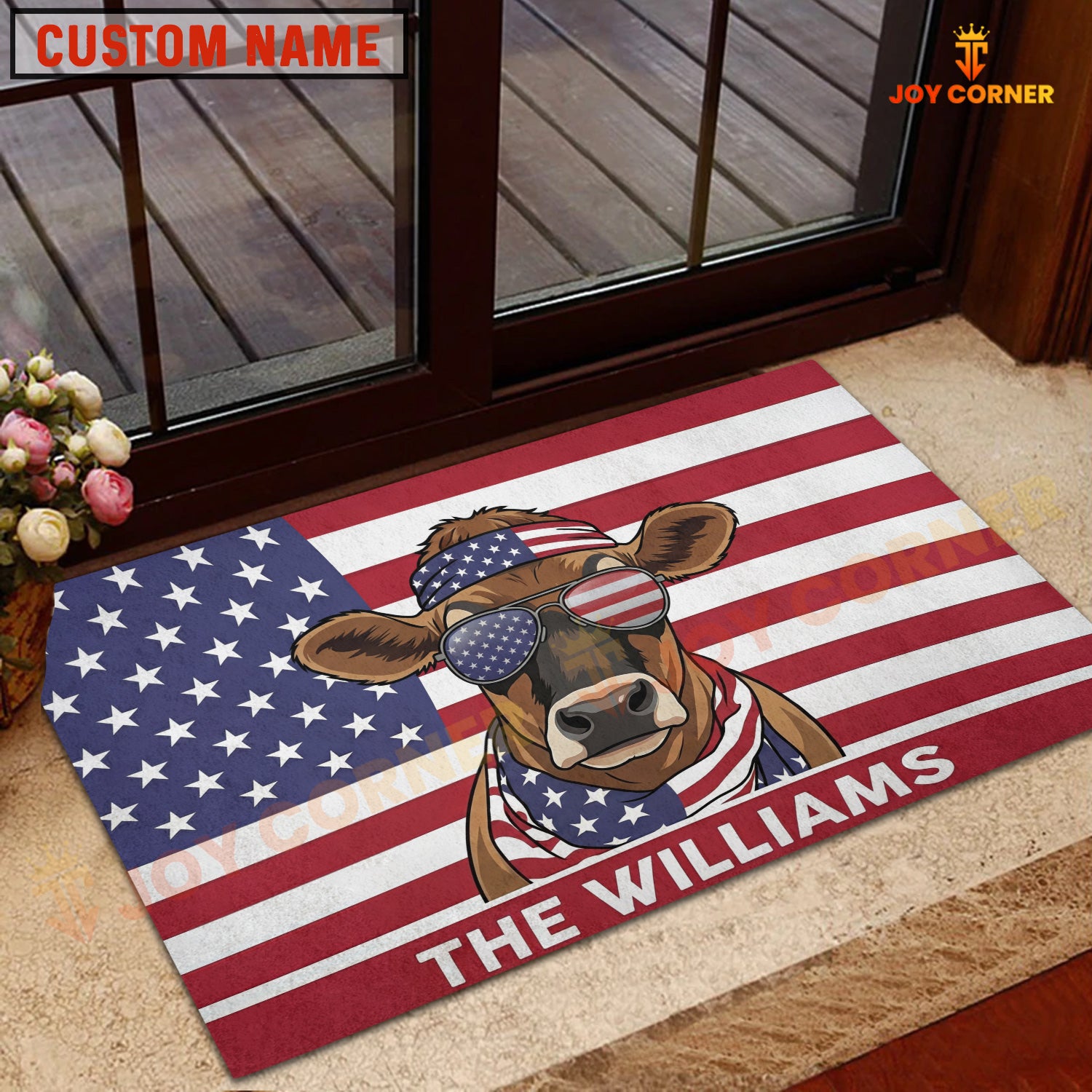 Joycorners Cool Cow Wearing USA Flag Bandana and Sunglasses Patriotic Personalized Name 3D Doormat (8 Breeds)