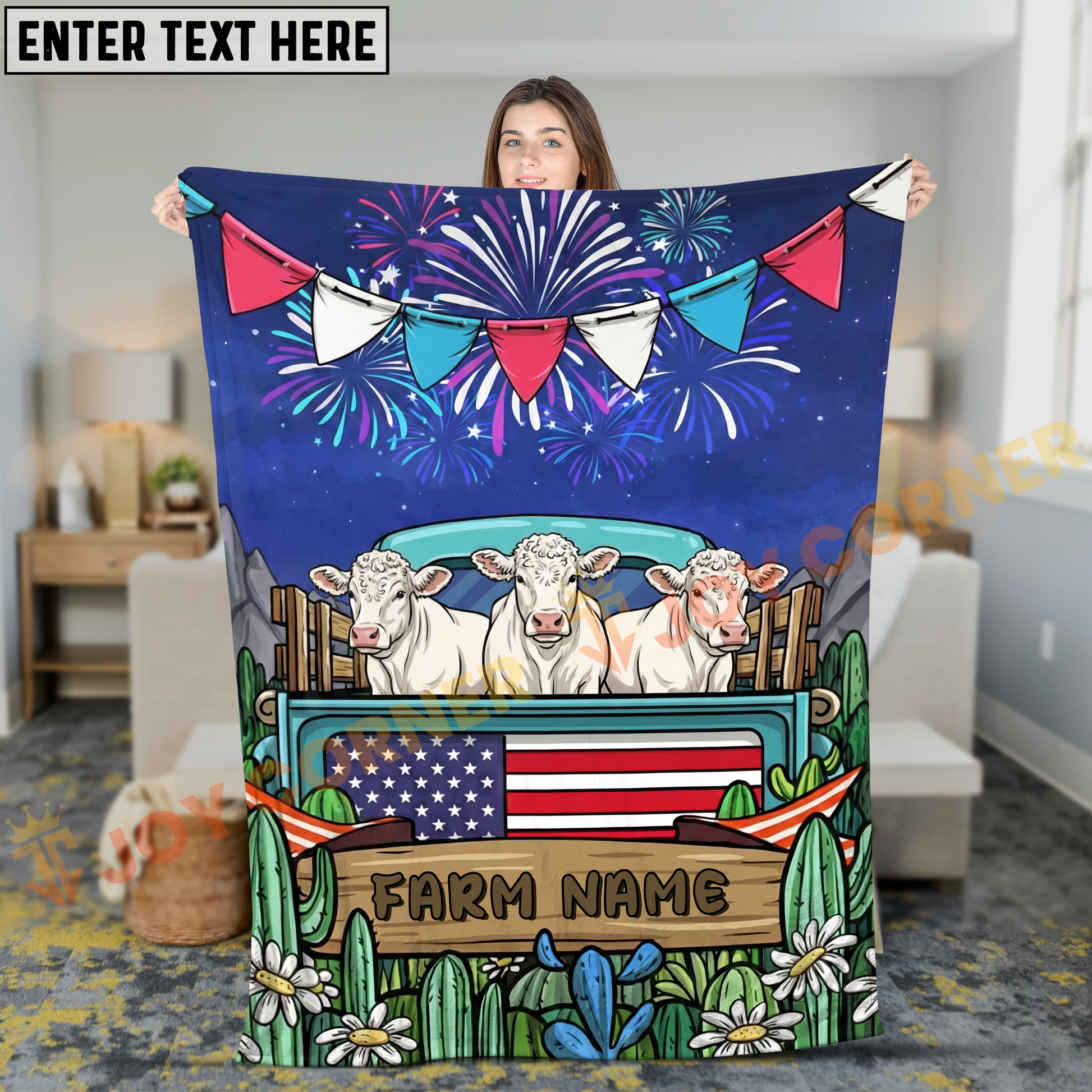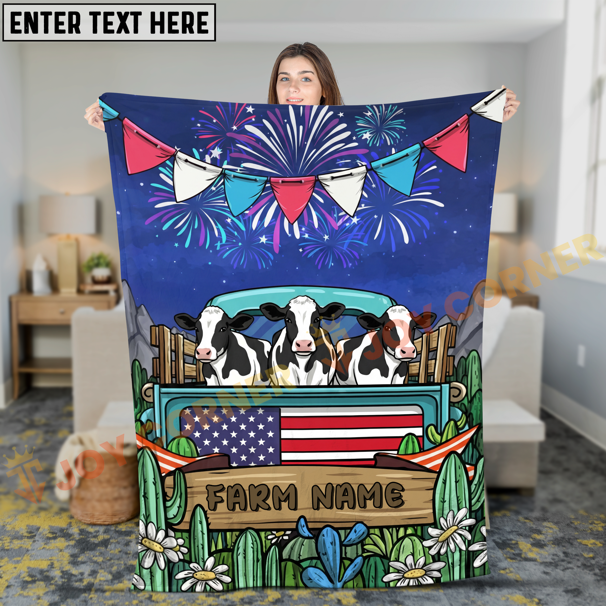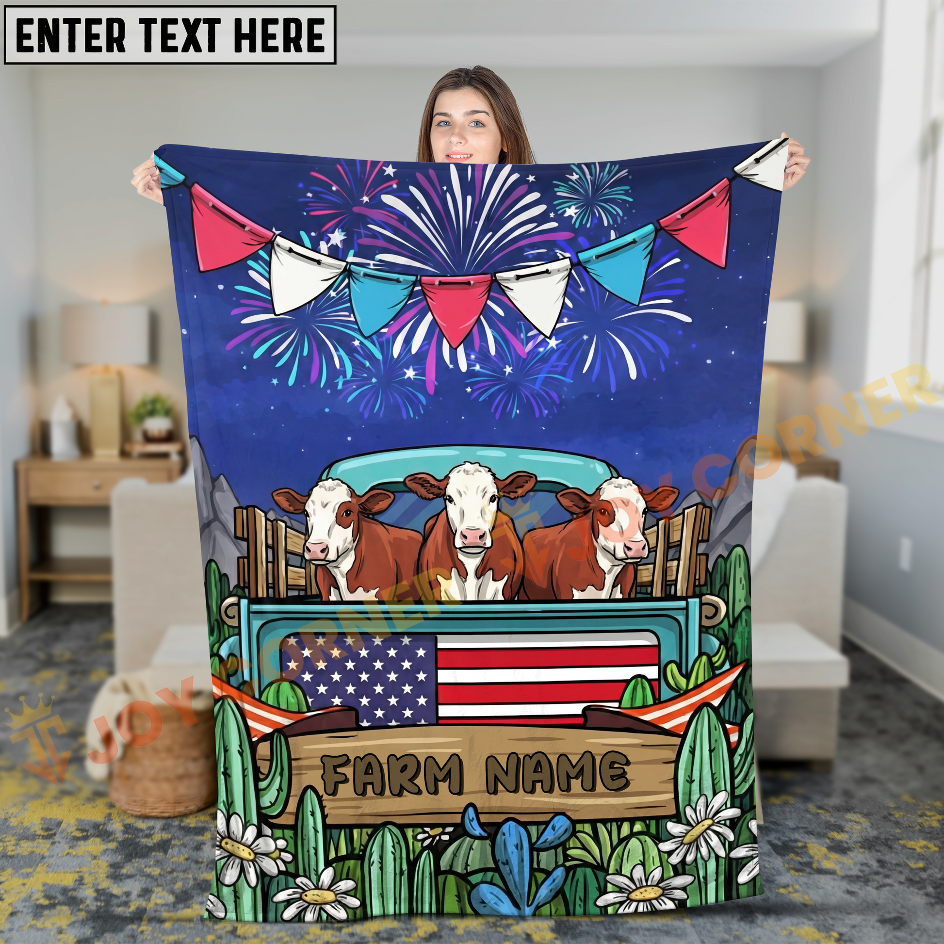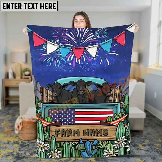 Joycorners Cows on Farm Truck with American Flag Fireworks Rustic Country Style Personalized Name 3D Blanket (8 Breeds)