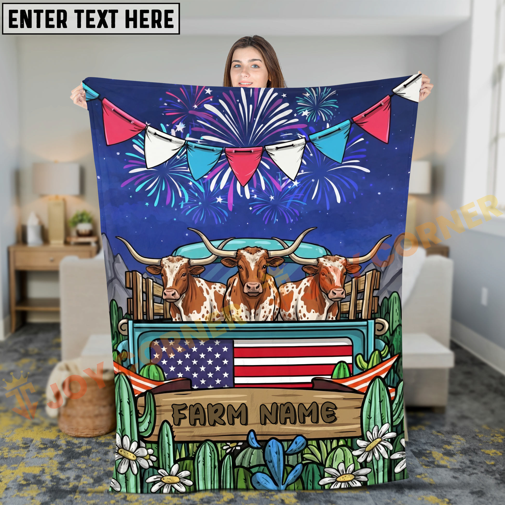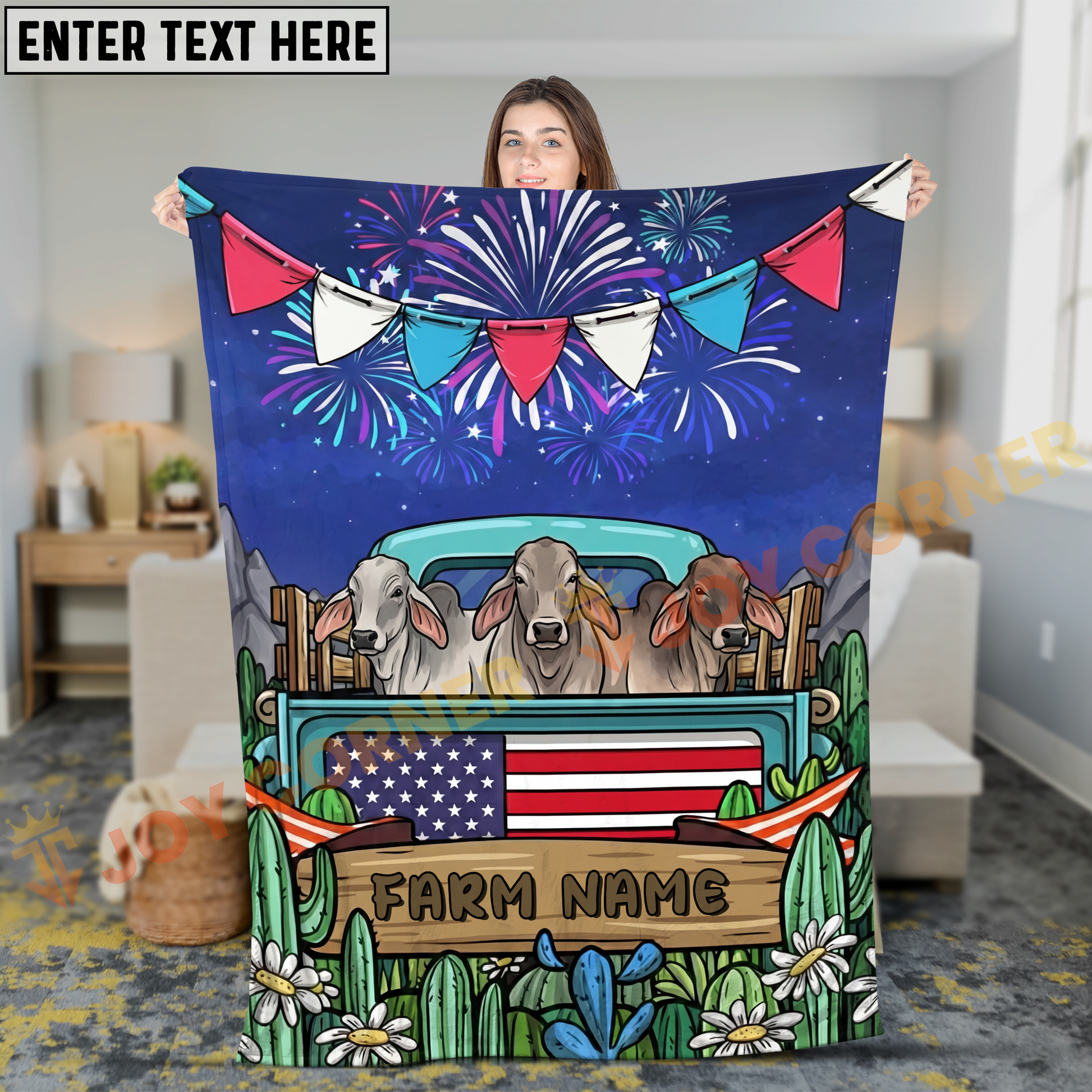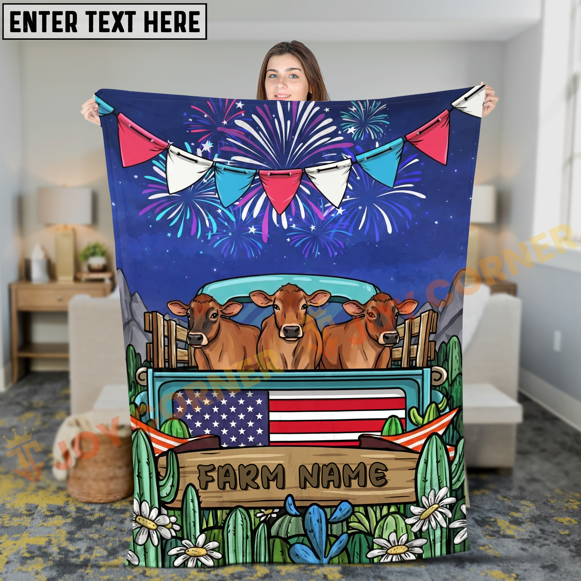 Joycorners Cows on Farm Truck with American Flag Fireworks Rustic Country Style Personalized Name 3D Blanket (8 Breeds)