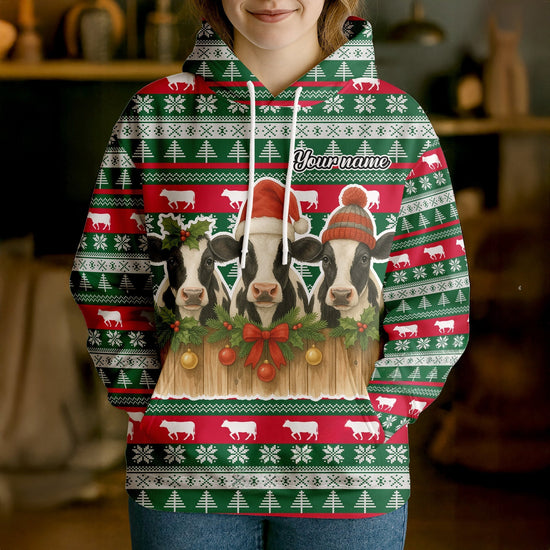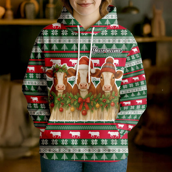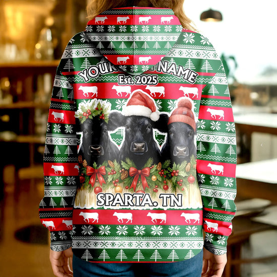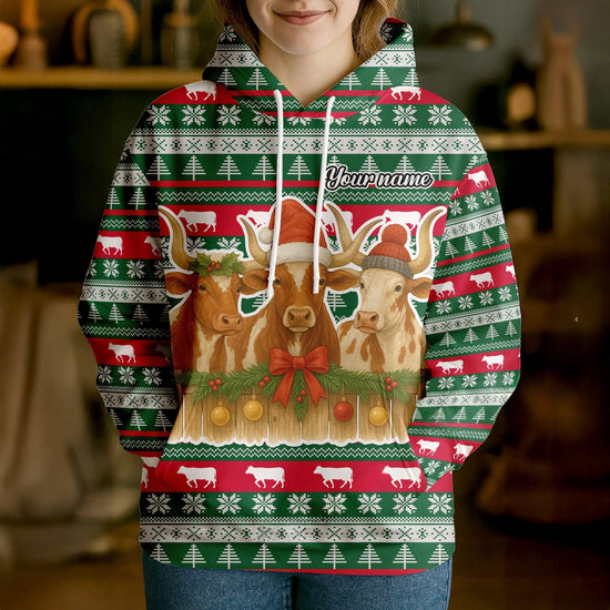 Joycorners Custom Farm Name Christmas Vibe Featuring Three Adorable Hoodie (8 Cattle Breeds)