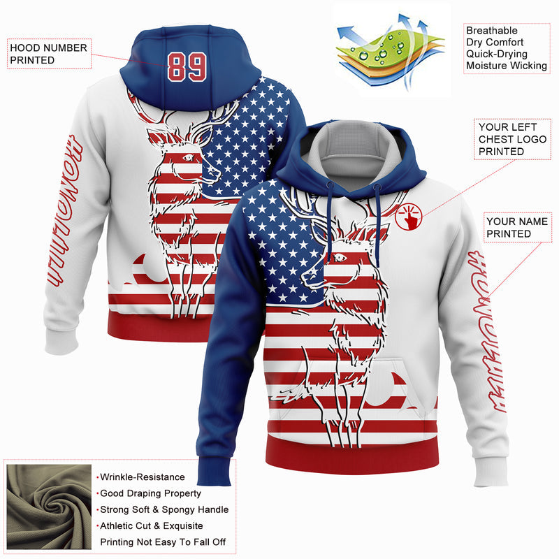 Joycorners Custom Stitched White Red-US Navy Blue 3D American Flag And Deer Hunting Sports Pullover 3D Hoodie