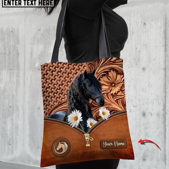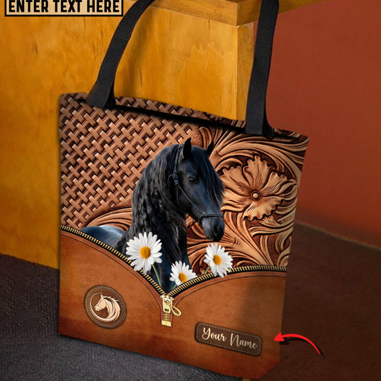 Joycorners Daisy Friesian Horse Carving Leather Pattern Custom Name 3D Tote Bag