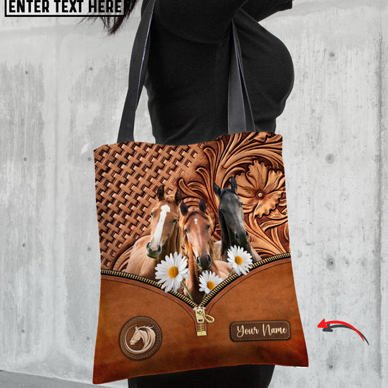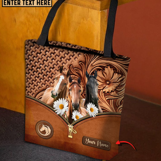 Joycorners Daisy Three Horses Lovers Carving Leather Pattern Custom Name 3D Tote Bag