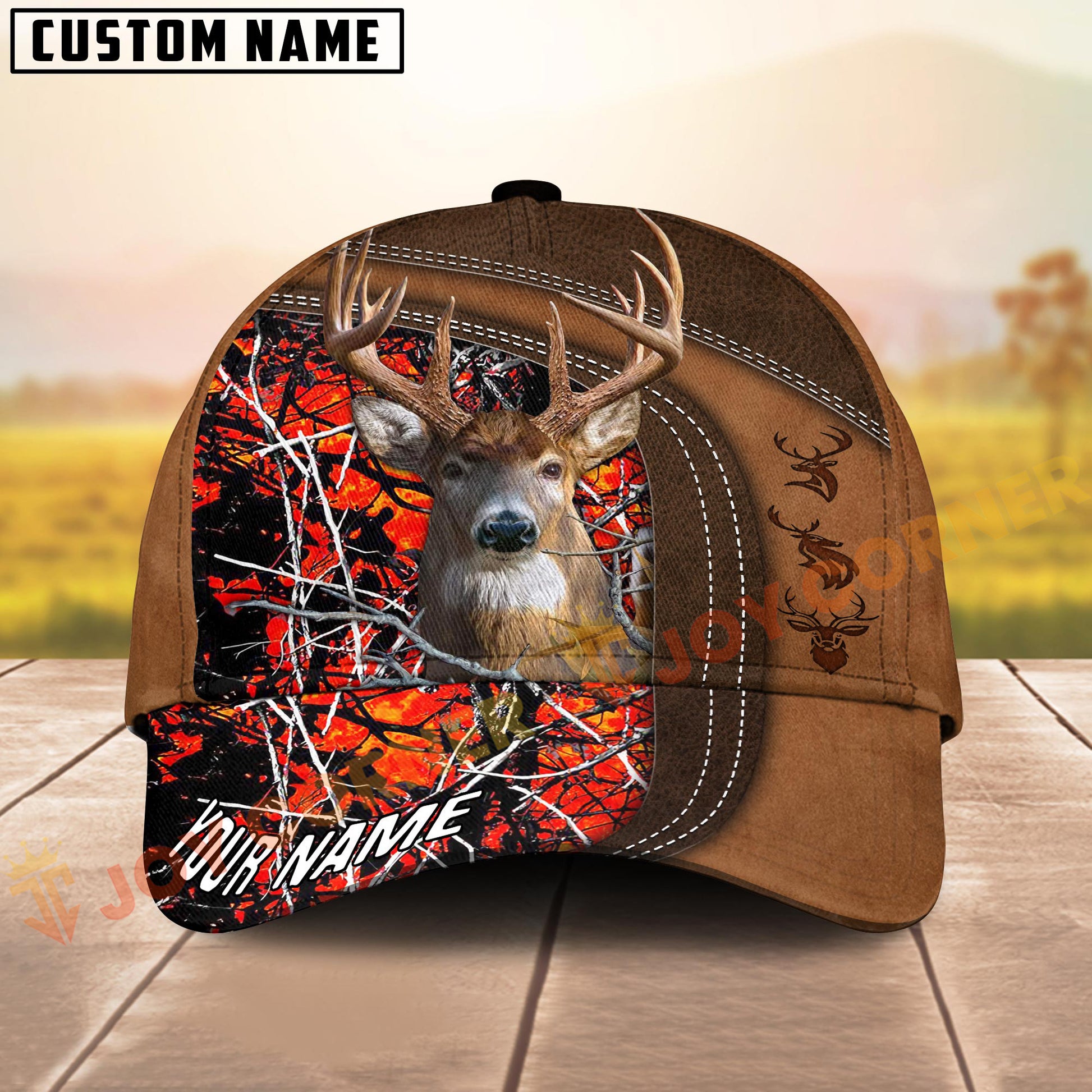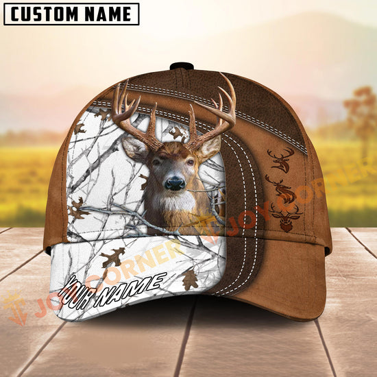 Joycorners Deer Hunting Brown Leather Framed Woodland Camo Custom Name 3D Cap