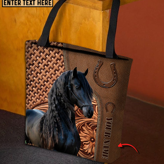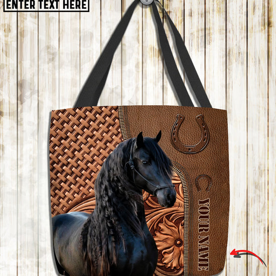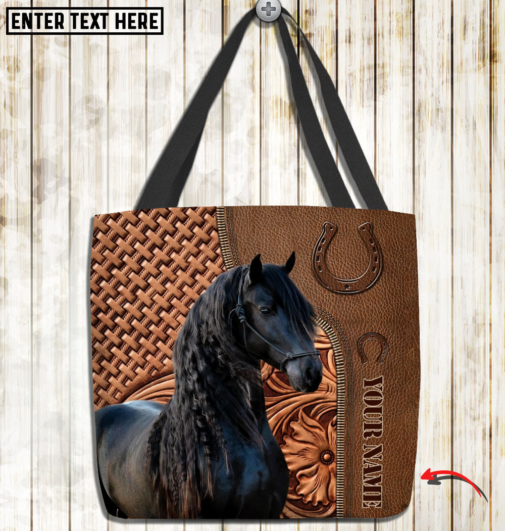 Joycorners Friesian Horse Carving Leather Pattern Custom Name 3D Tote Bag