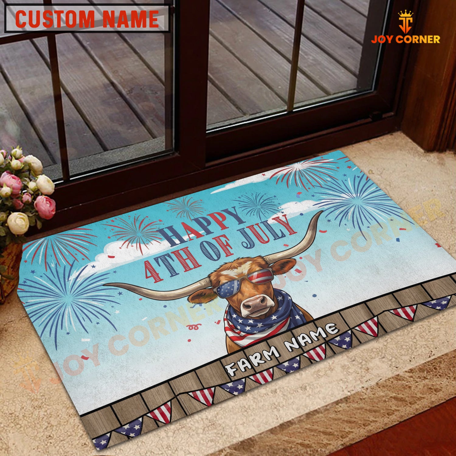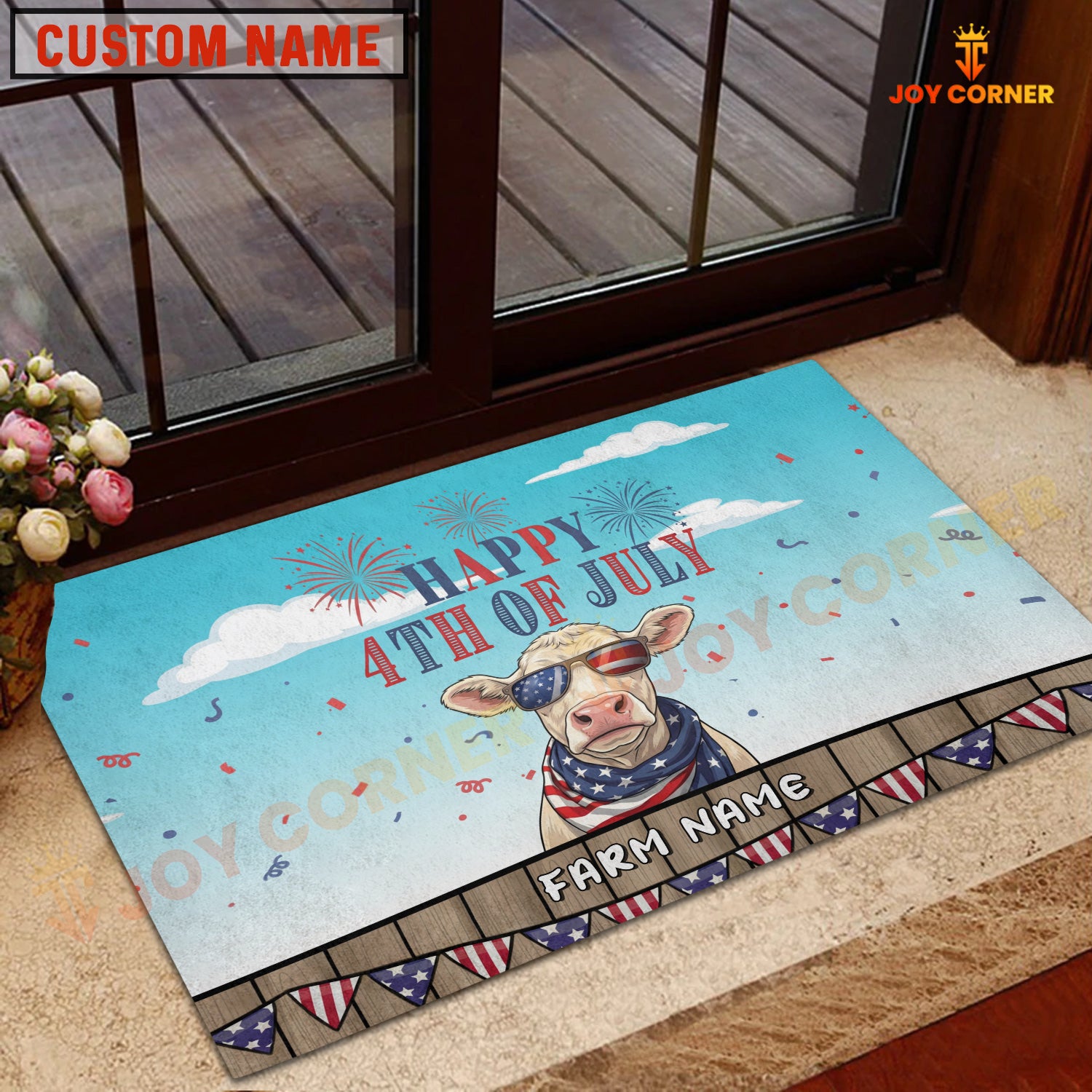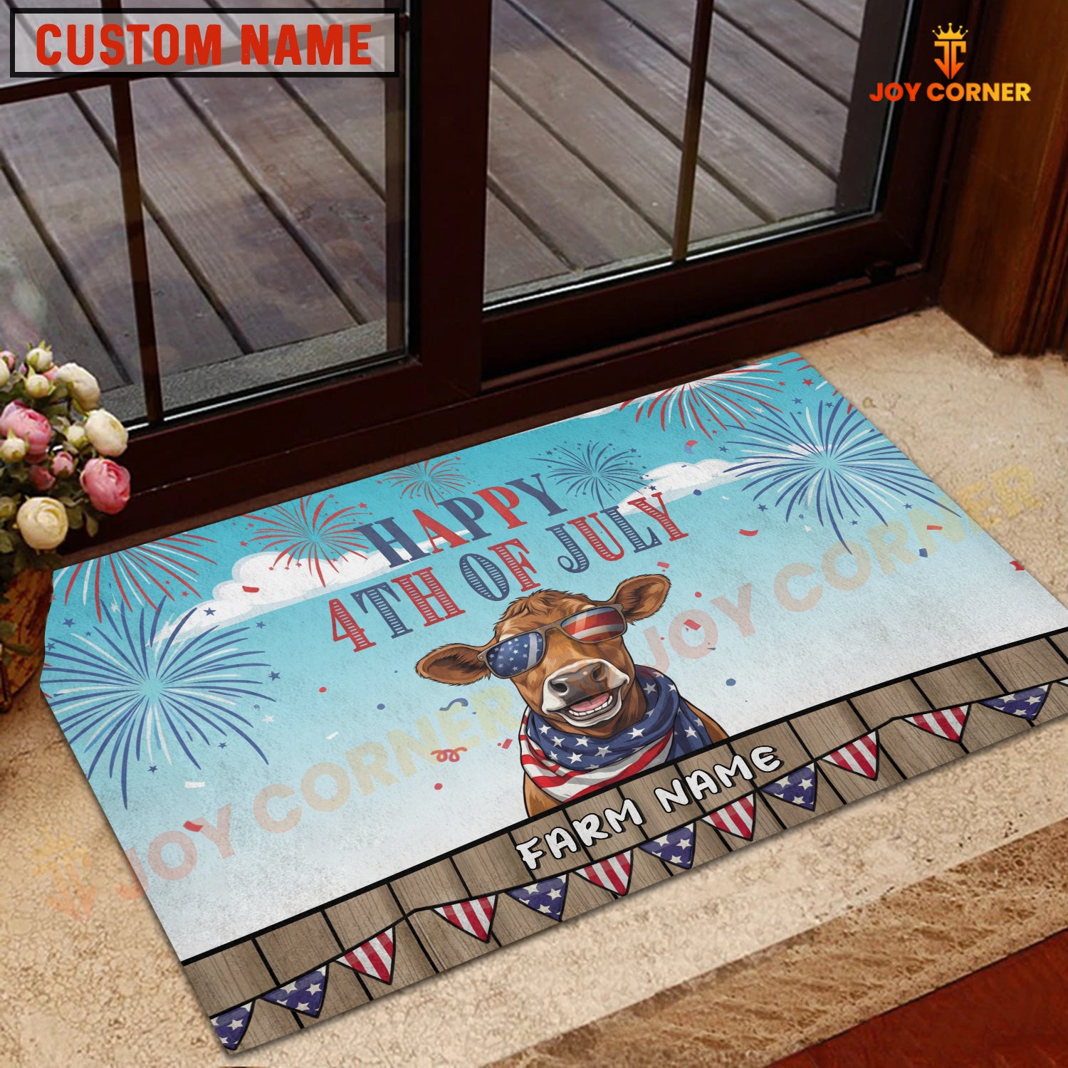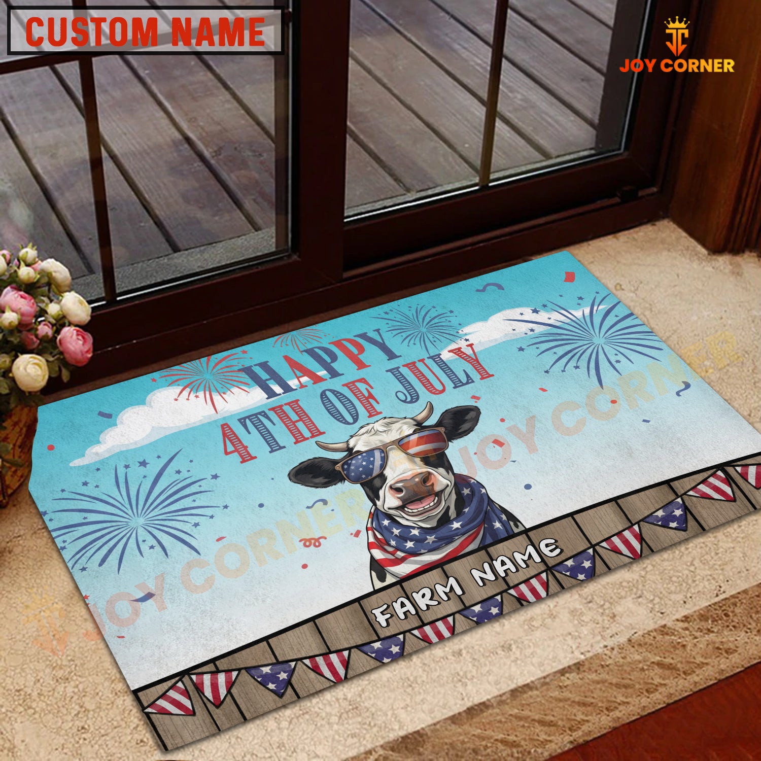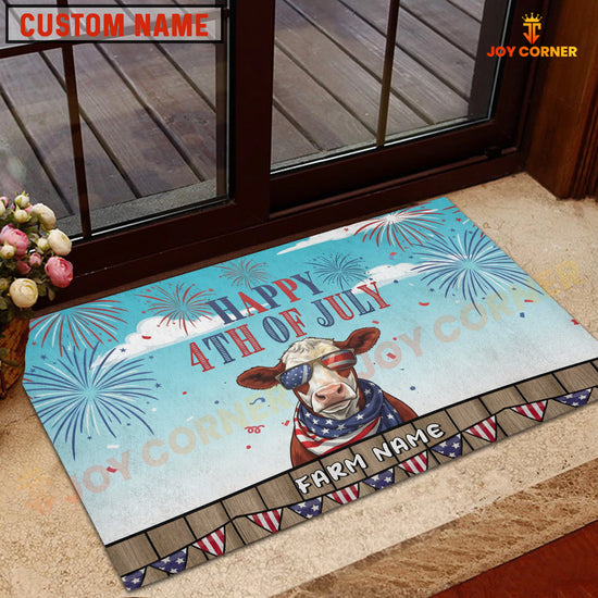 Joycorners Happy 4th of July Cow with USA Scarf Fireworks Personalized Name 3D Doormat (8 Breeds)