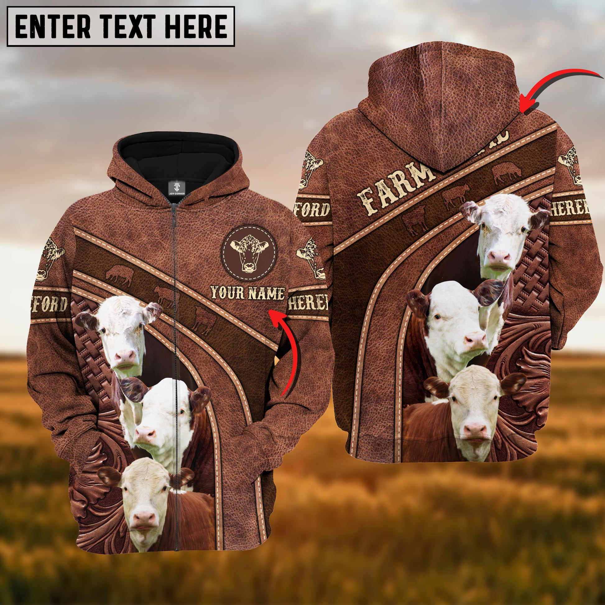 Joycorners Hereford Personalized Name Brown Carving Leather Pattern 3D Hoodie