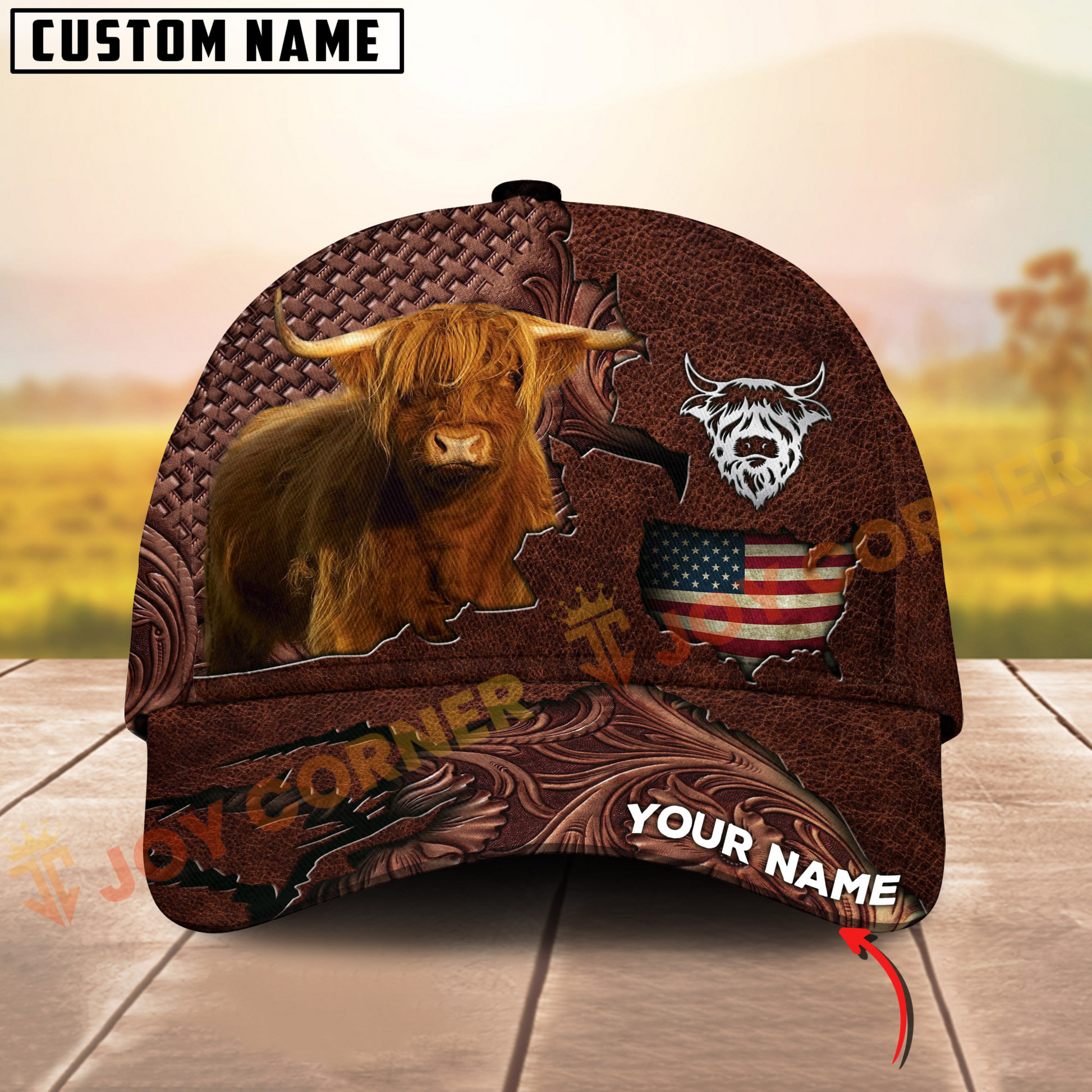 Joycorners Highland Cattle USA Map Leather Pattern Personalized Name 3D Cap