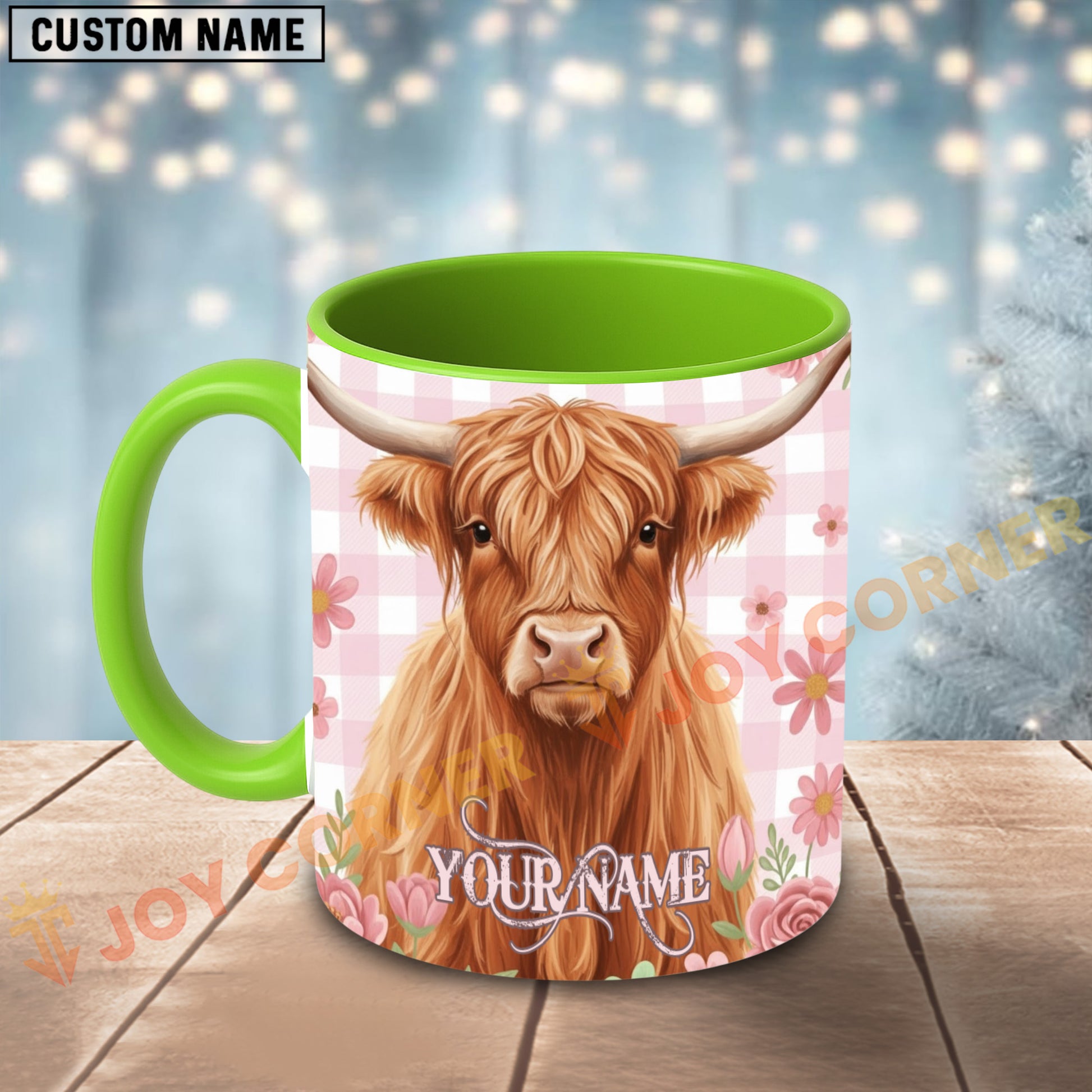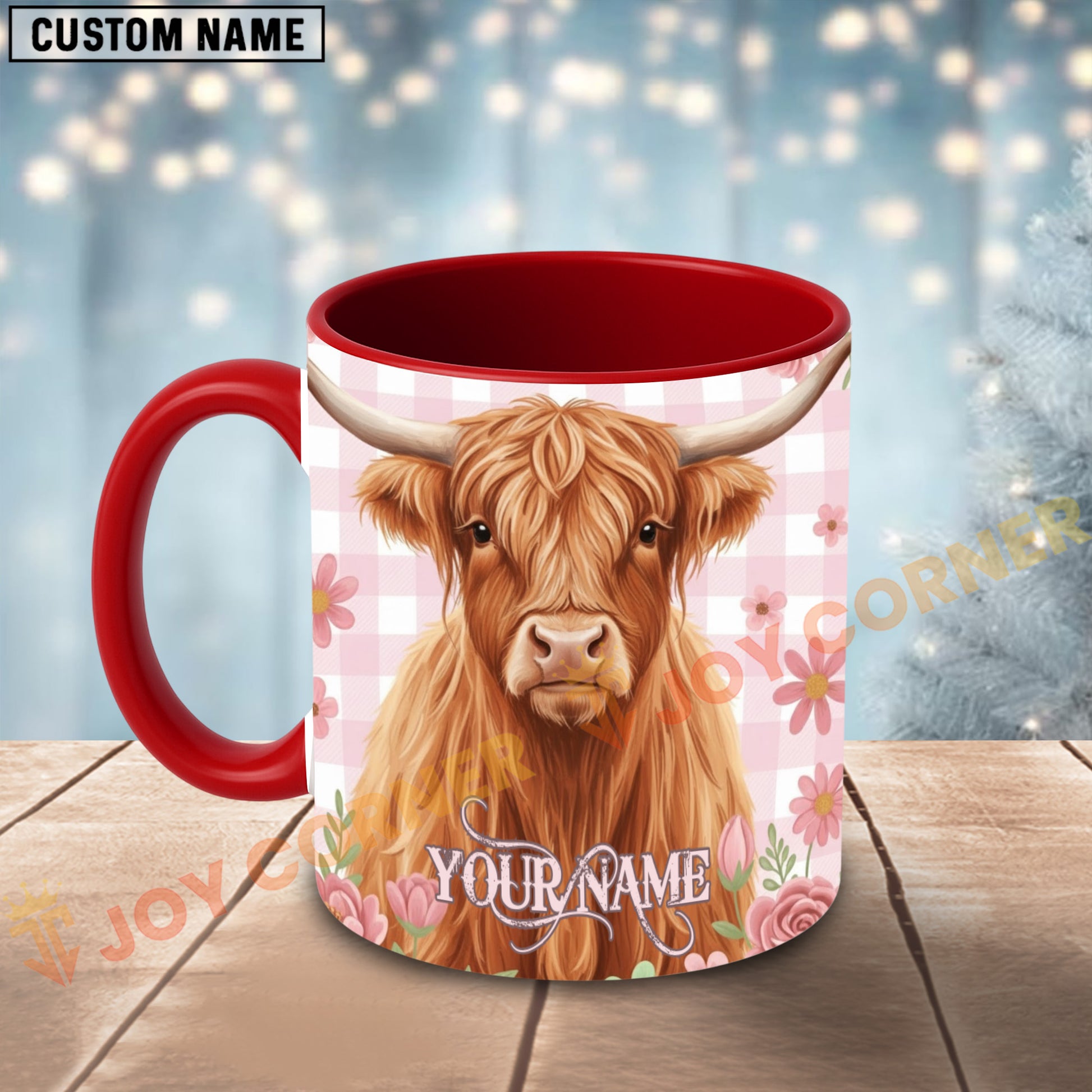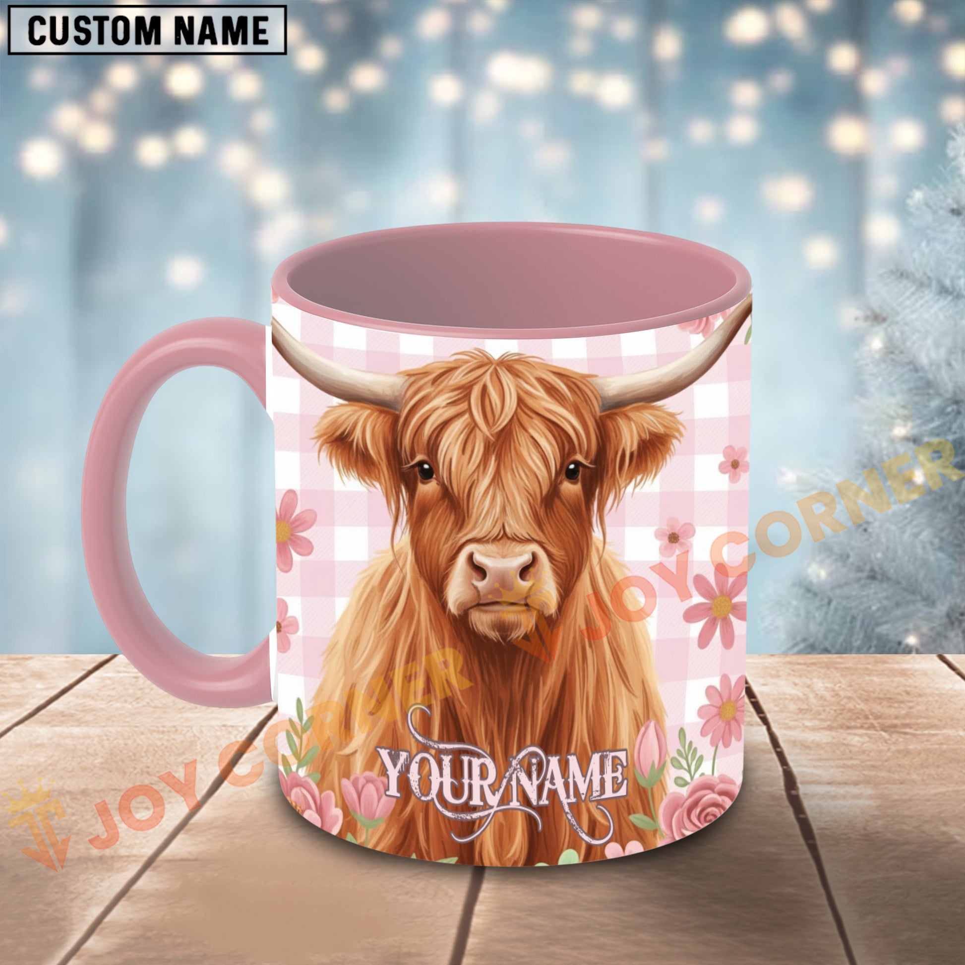 Joycorners Highland Cow Pink Plaid Flowers Custom Name Mug