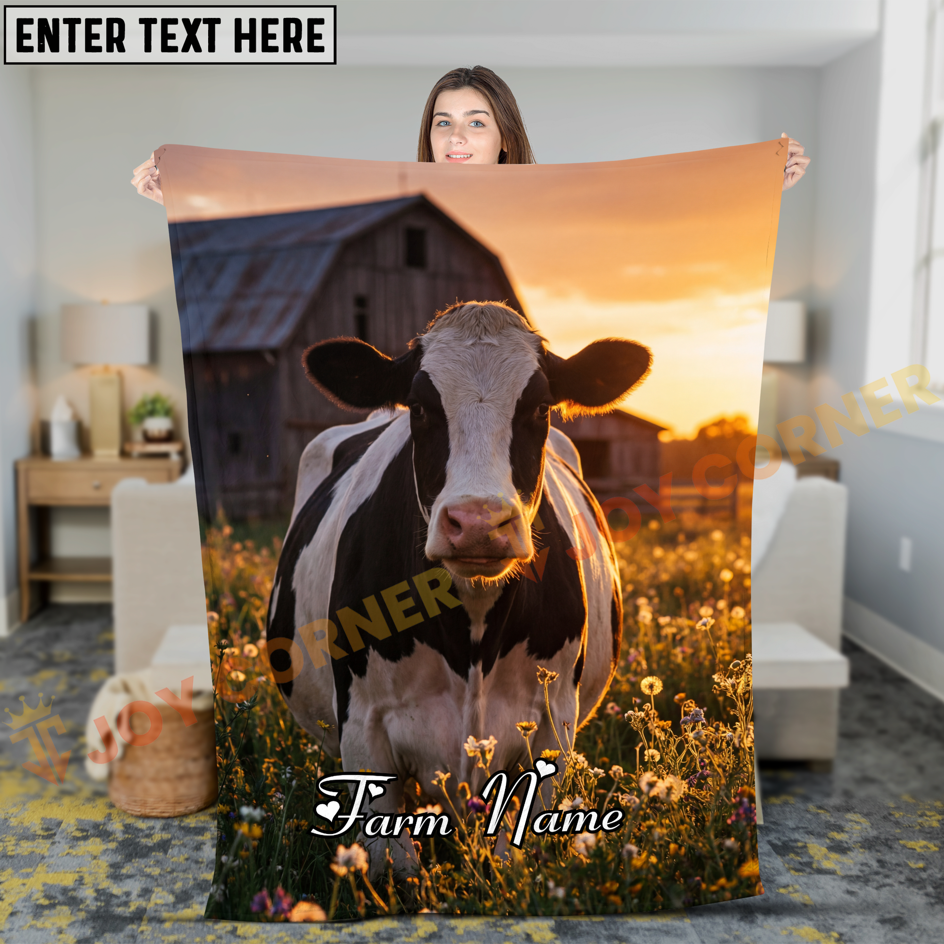 Joycorners Holstein Cow In Golden Sunset Field With Red Barn Personalized Name Blanket