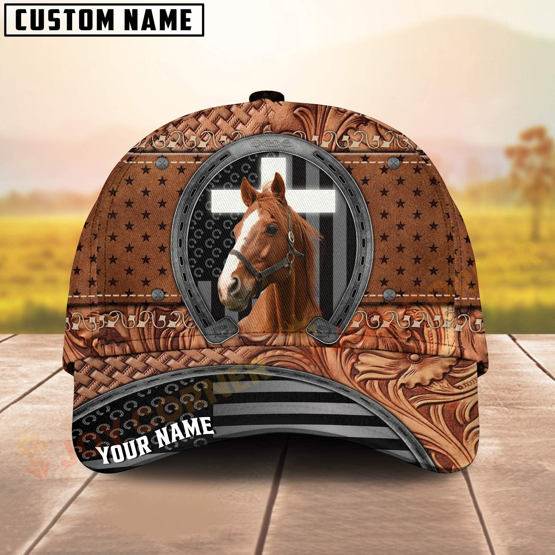 Joycorners Horse Tooled Leather Horseshoe Cross Pattern Personalized Name 3D Classic Cap (8 Breeds)