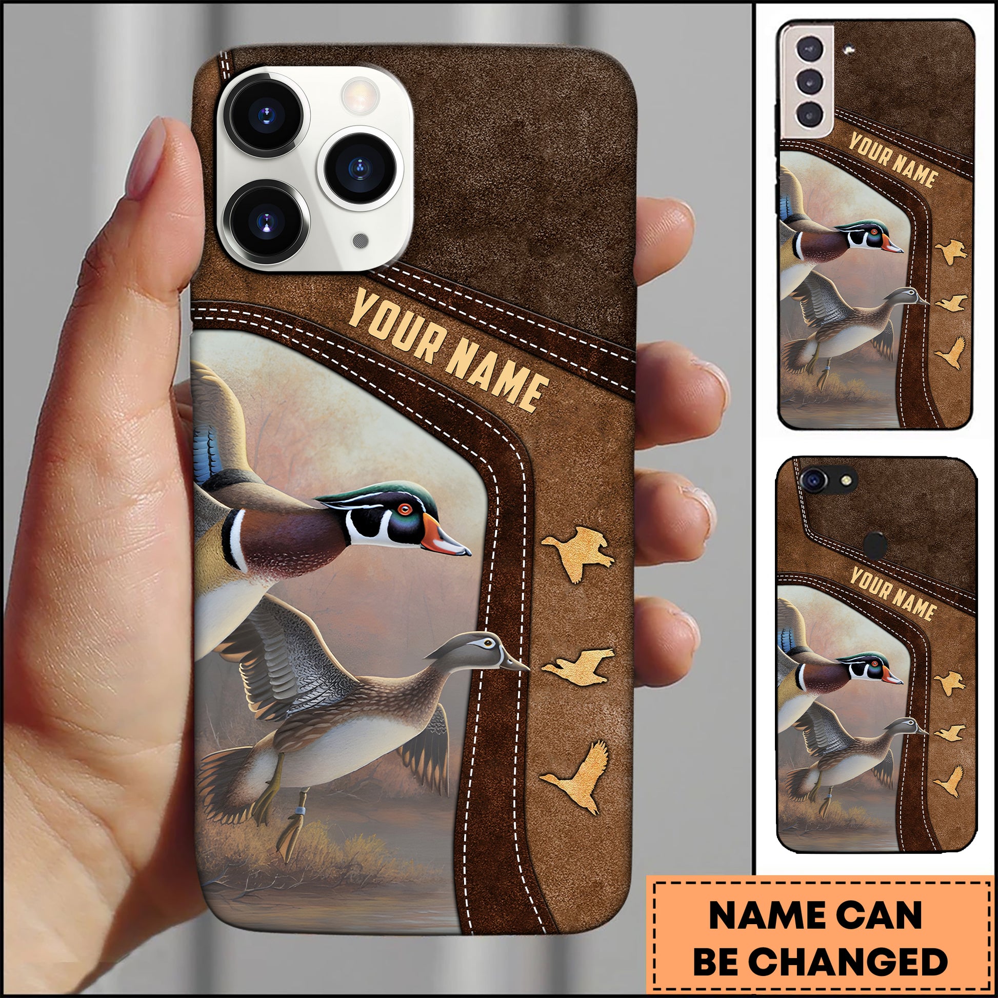 Joycorners Hunting Phone Case Duck Flying Leather Stitch Rustic Brown Personalized Name Phone Case