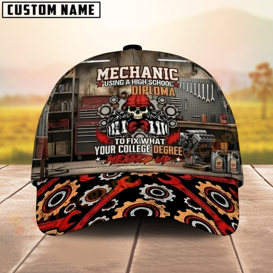 Joycorners Mechanic Diploma Cap – Skull with Tools, Garage Workshop 3D Print, Custom Name Gear Brim Hat
