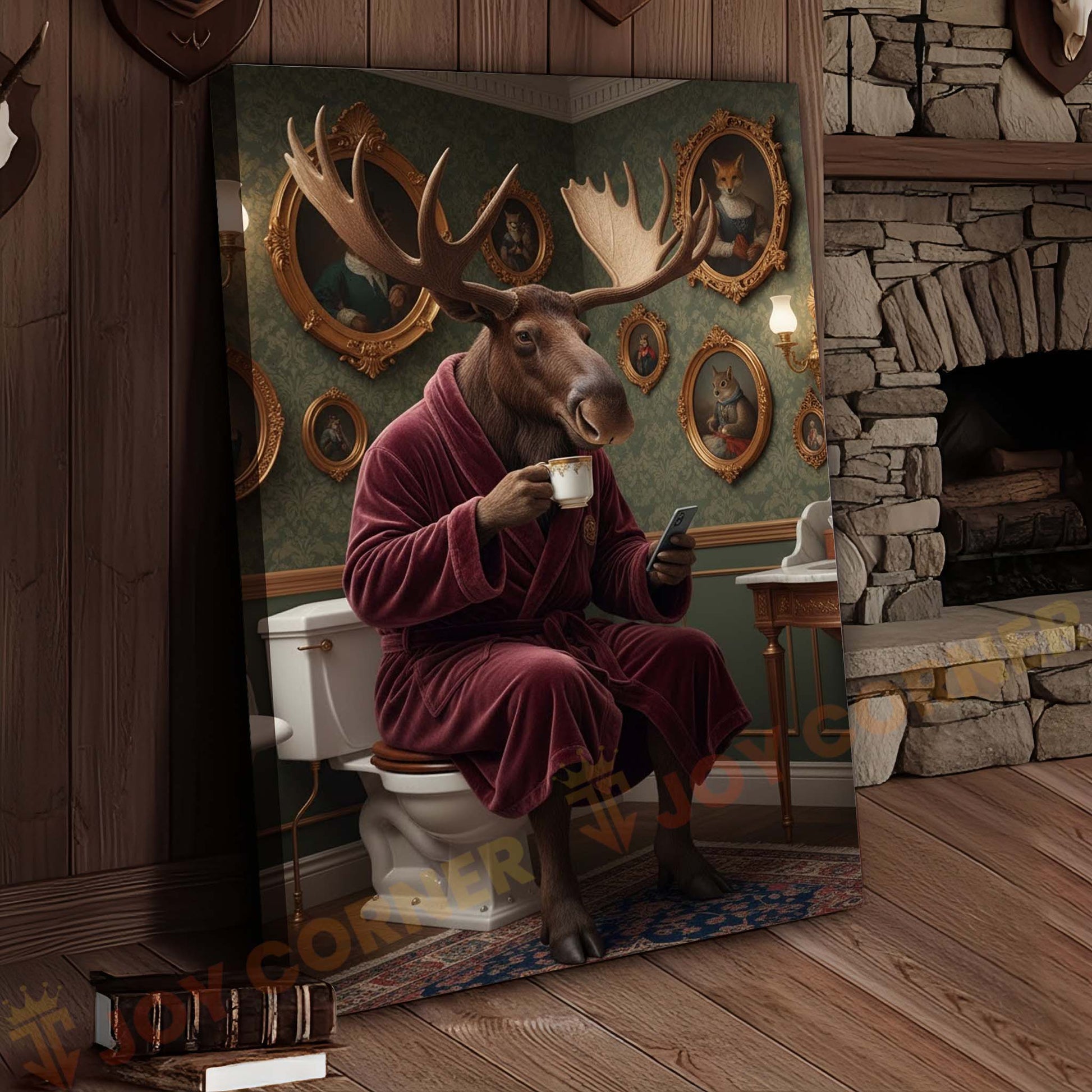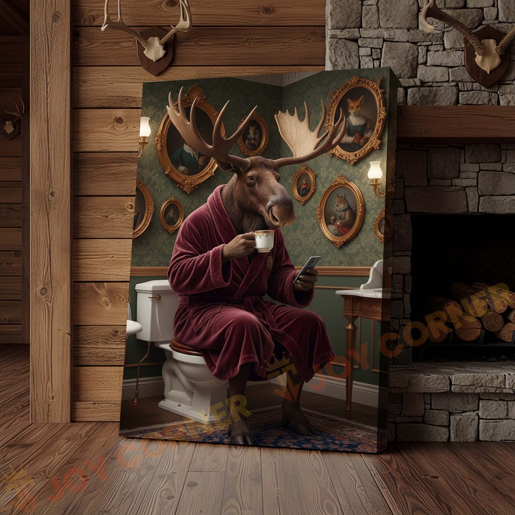 Joycorners Moose Drinking Coffee on Toilet Wrapped Canvas
