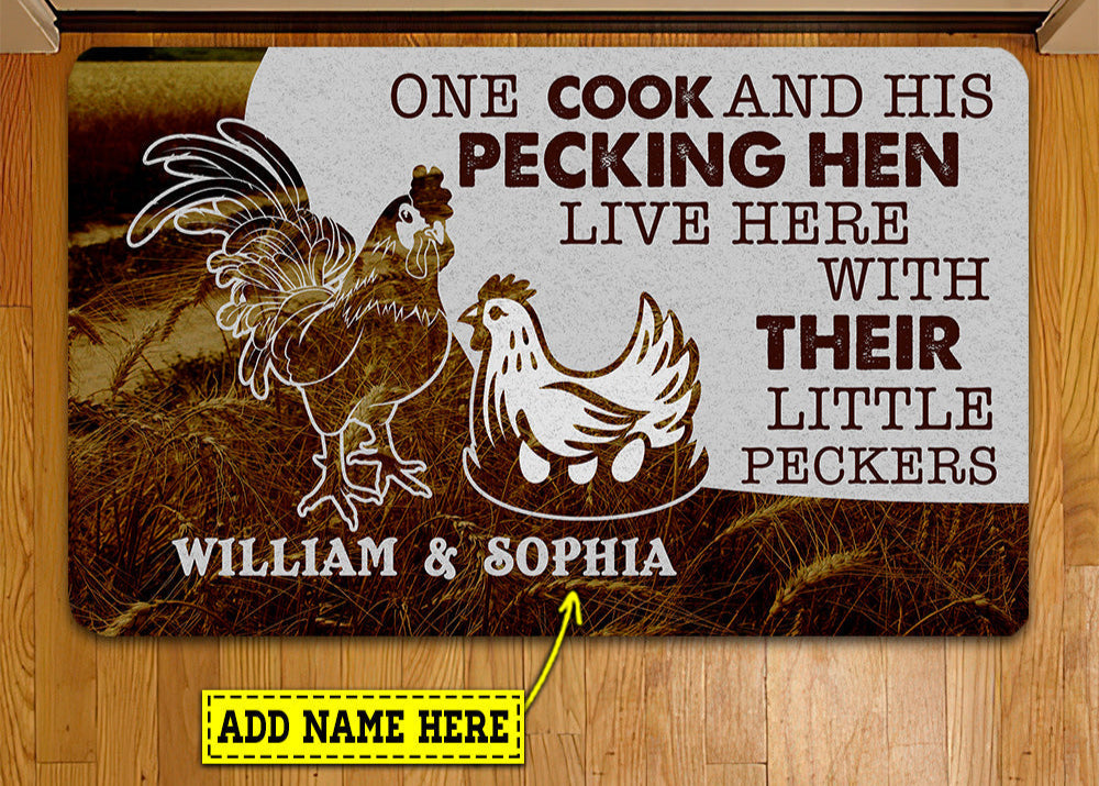 Joycorners Personalized Chicken Doormat, One Cook His Pecking Hen Live Here Gift For Chicken Lovers, New Home Gift, Housewarming Gift, Chicken Decor LM0210