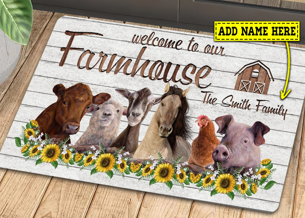 Joycorners Personalized Farm Animals Doormat, Welcome To Our Farmhouse Gift For Farmers, New Home Gift, Housewarming Gift, Farm Decor LM0210