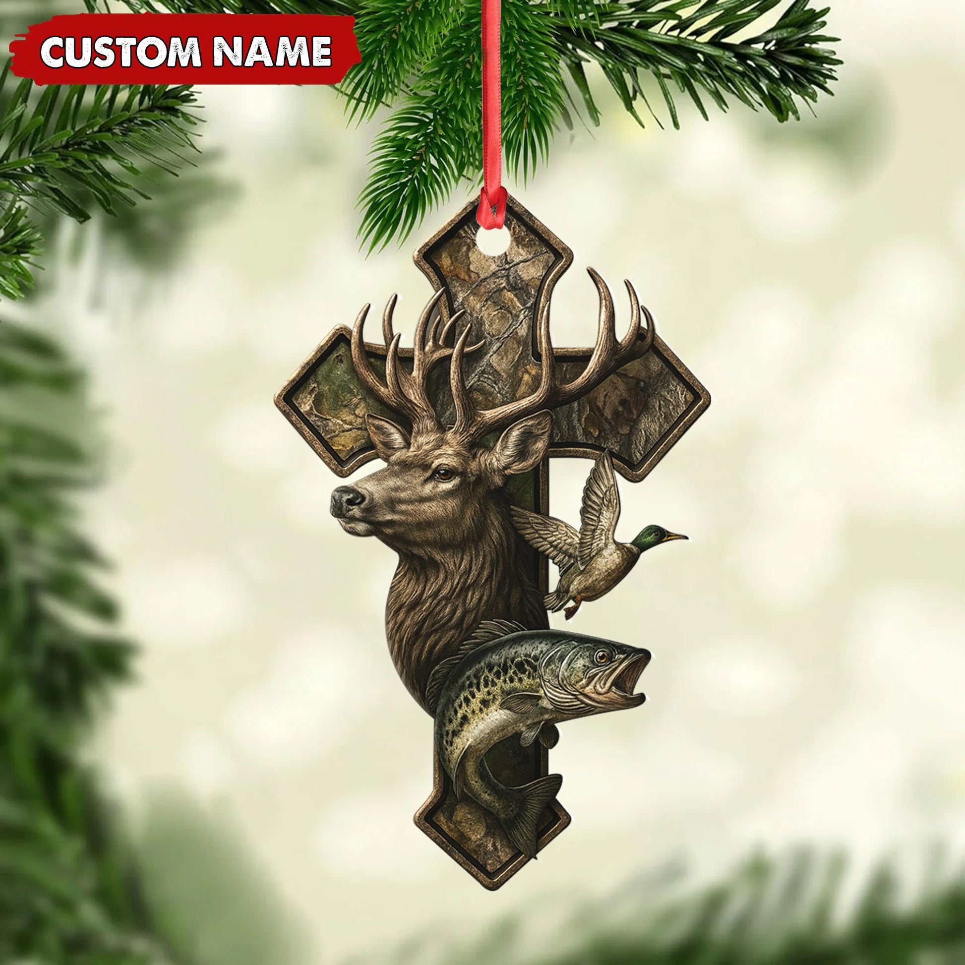 Joycorners Personalized Hunter Acrylic Ornament – Deer, Duck & Fish Cross Design for Christmas Tree Decor MT1111