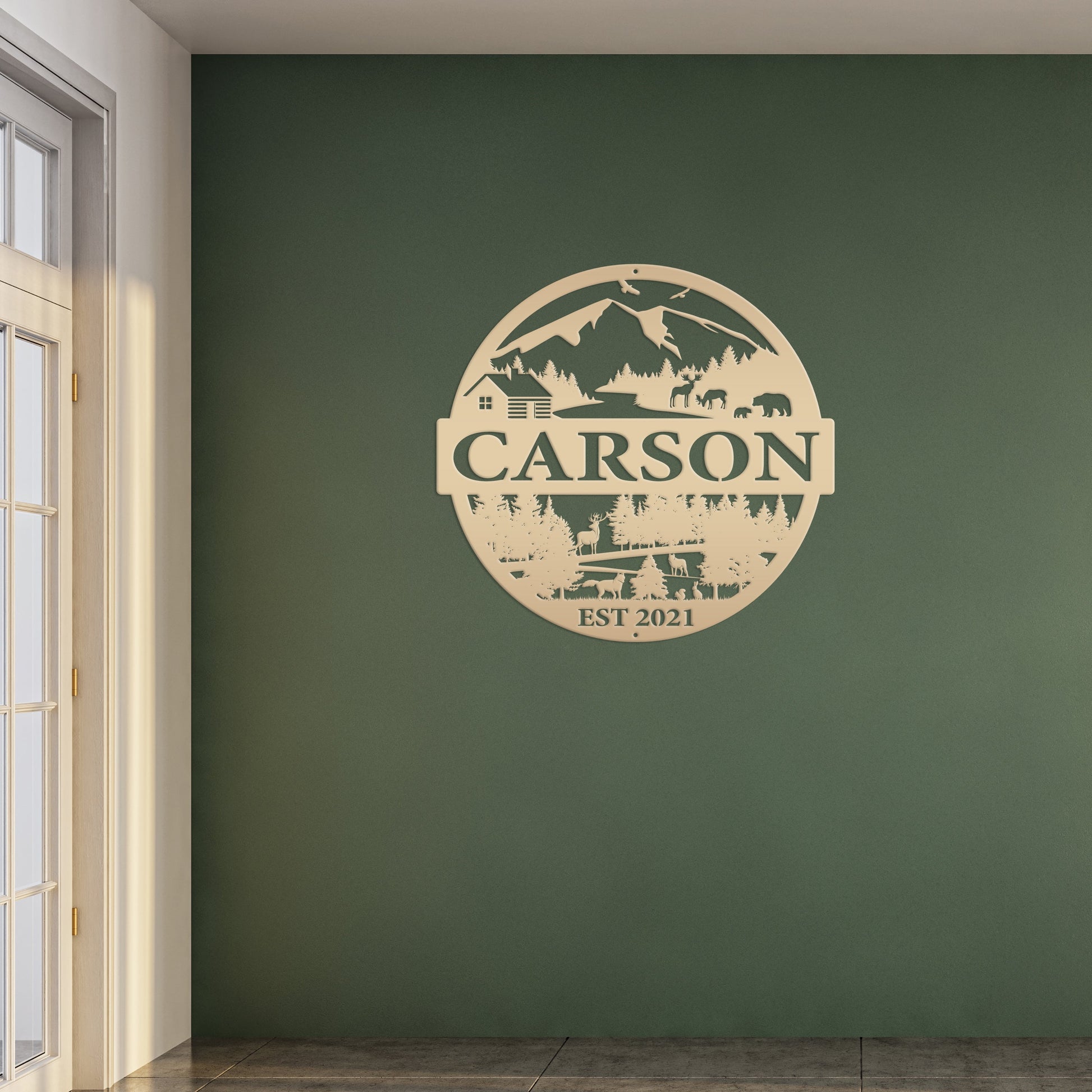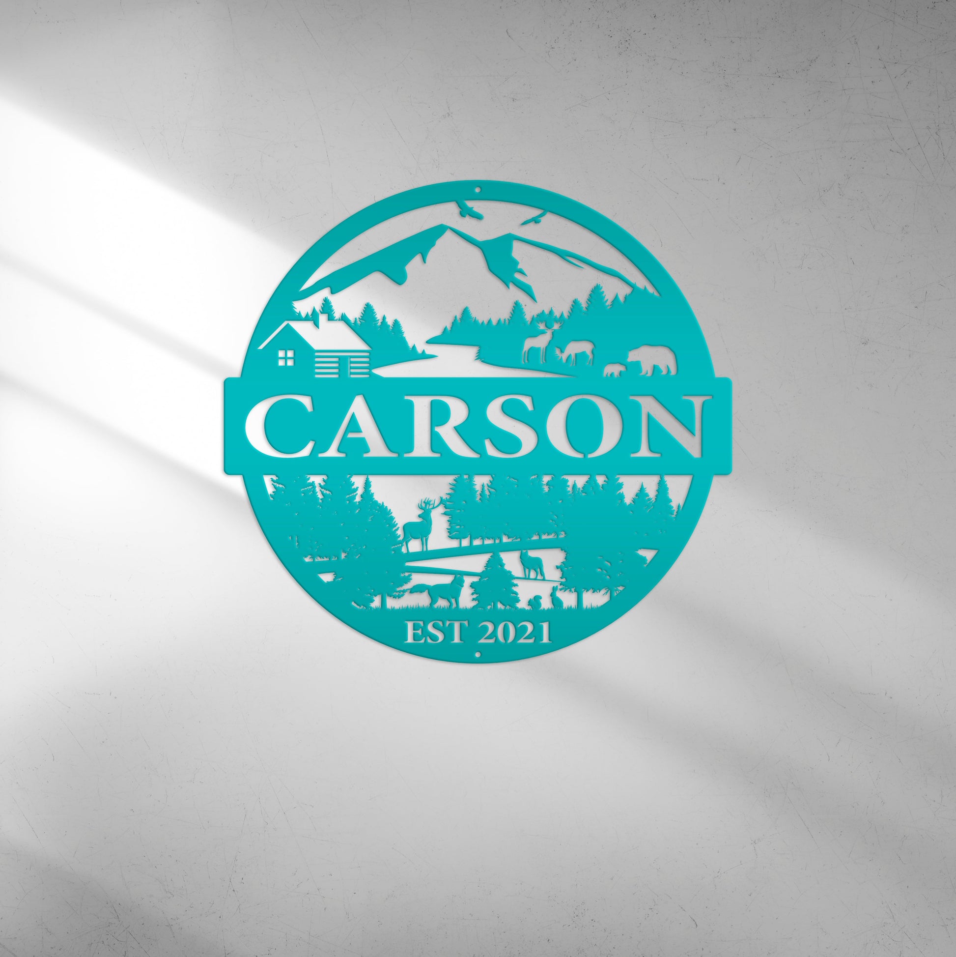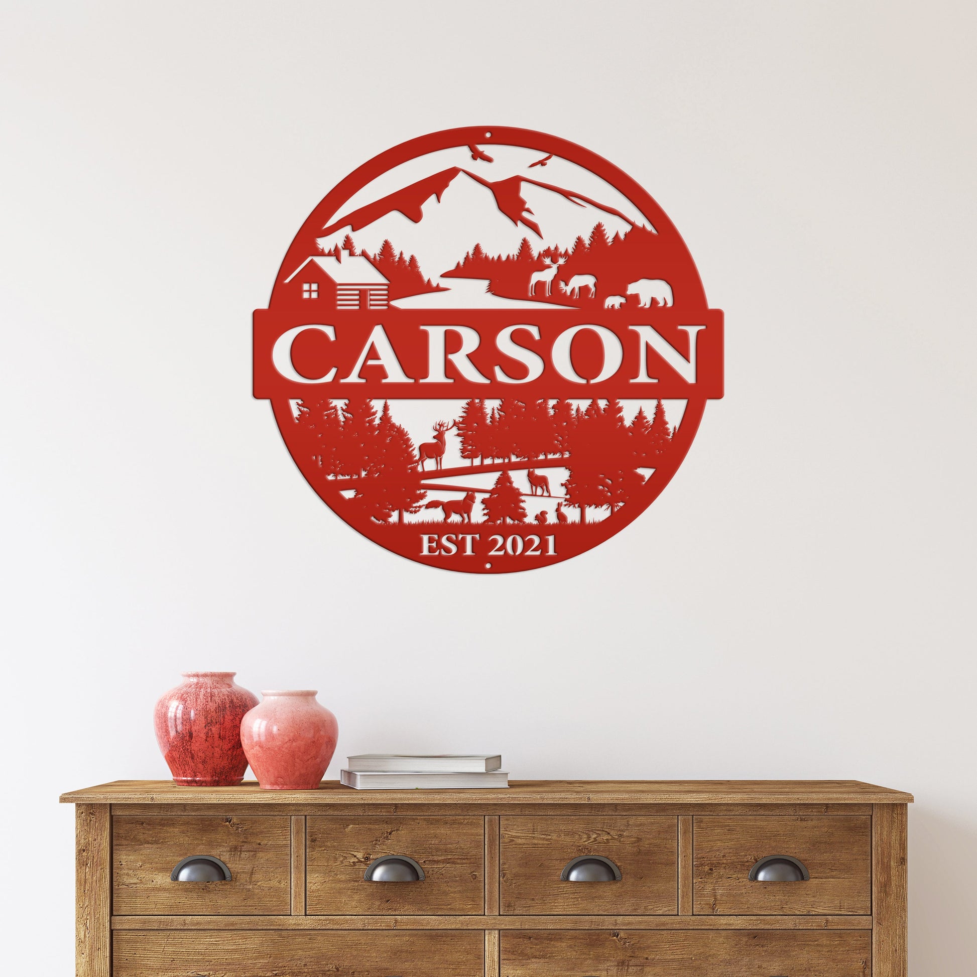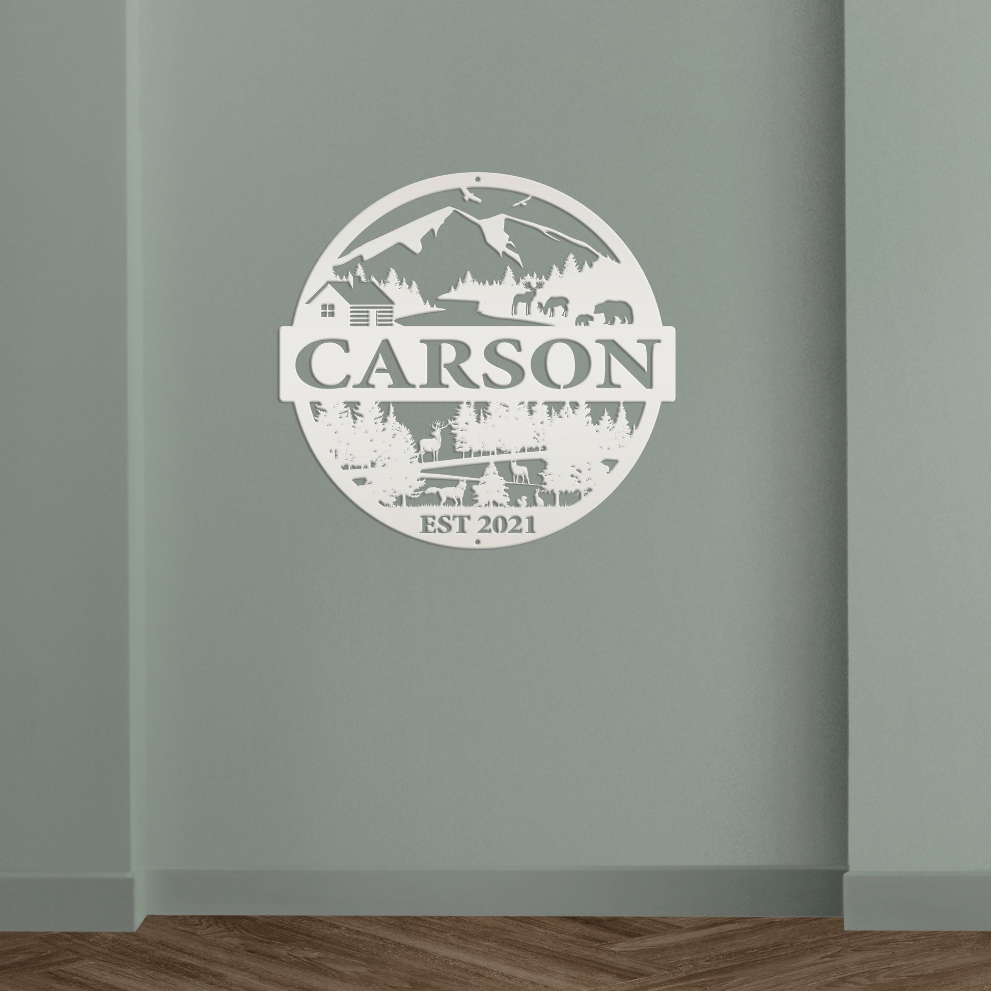 Joycorners Personalized Mountain Cabin Scene with Established Date Metal Sign-Cabin-Hunting Themed Sign-Decor-Outdoor Cabin-Lodge Decor LM0110