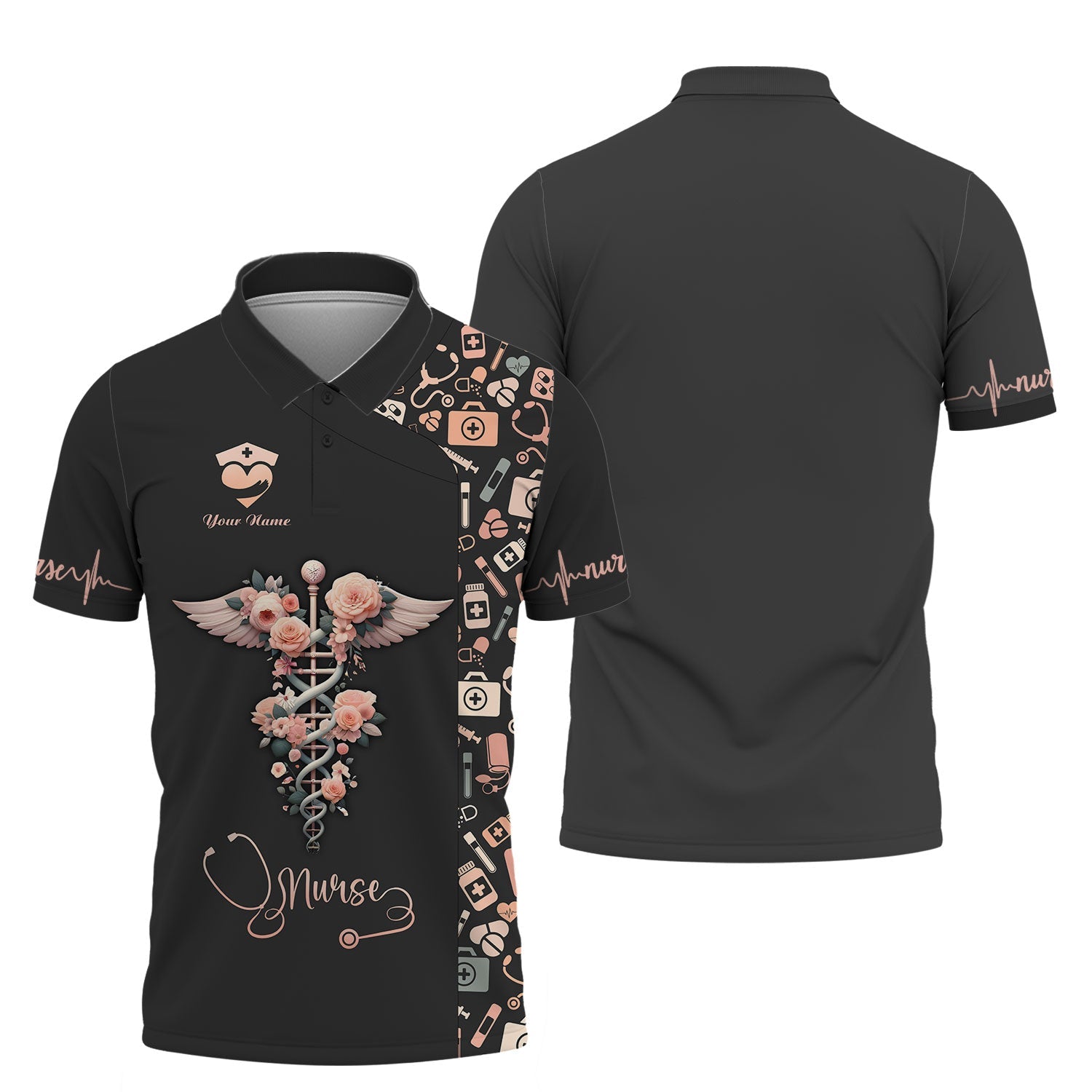 Joycorners Personalized Nurse Shirt, Floral Caduceus with Angelic Wings Design MT2509