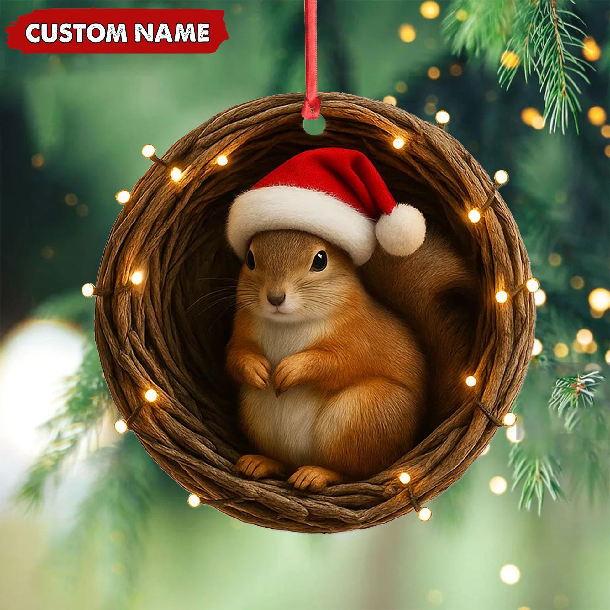 Joycorners Personalized Squirrel Christmas Ornament, Custom Name Woodland Nest Santa Hat Decoration, Cute Holiday Tree Hanging Gift for Animal Lovers MT2411