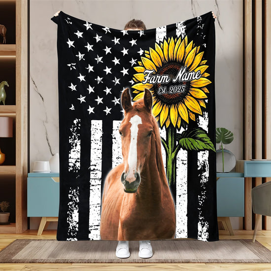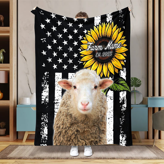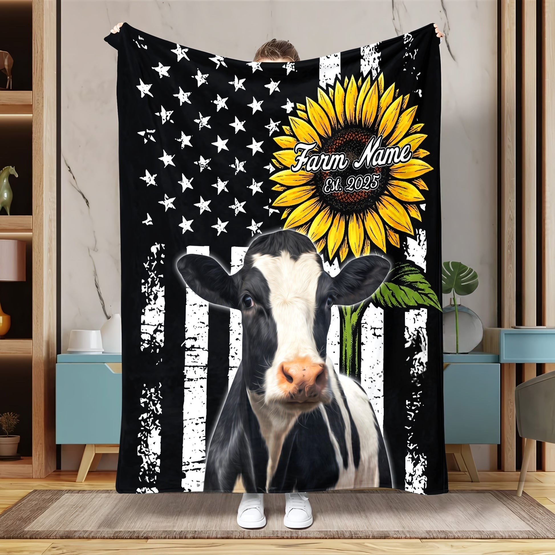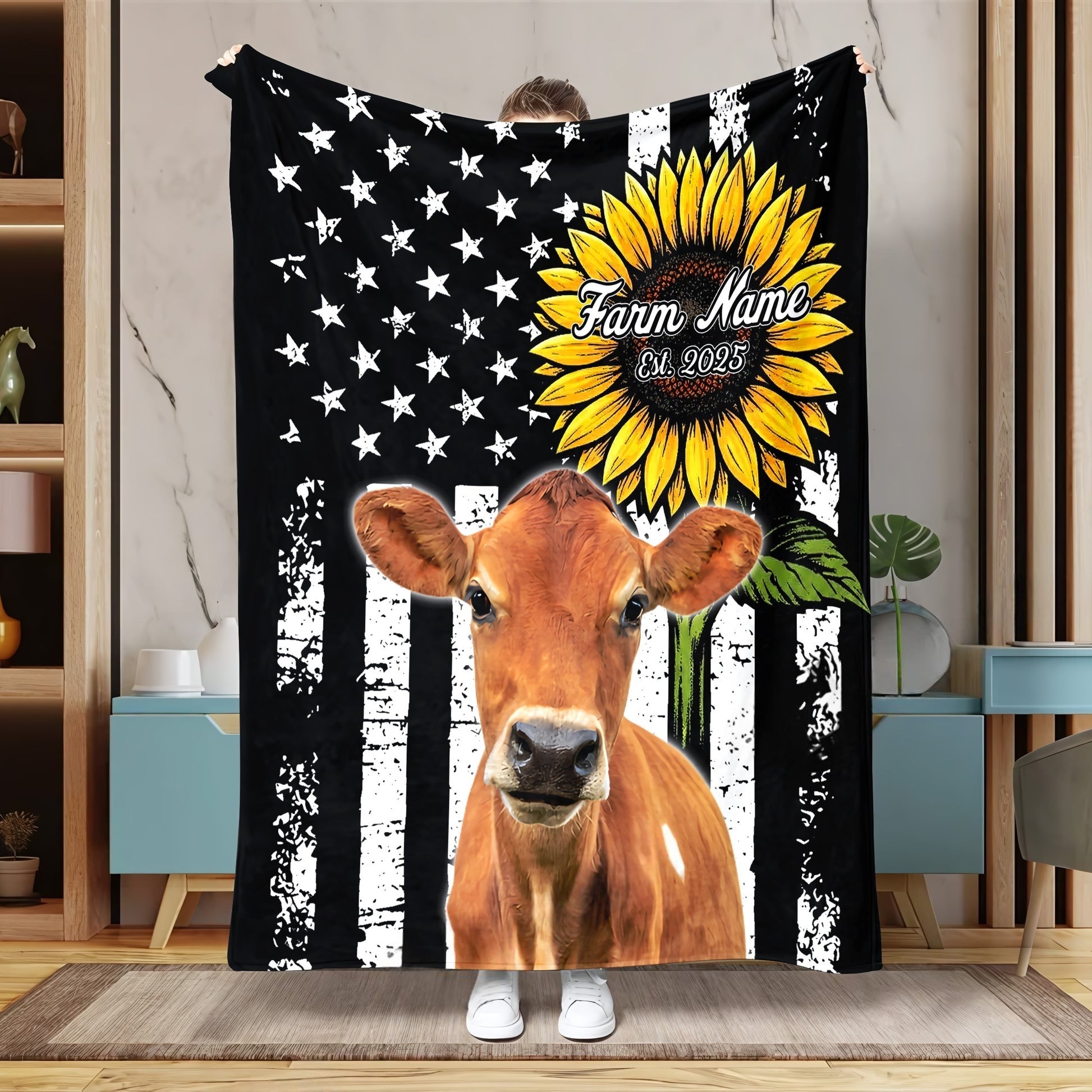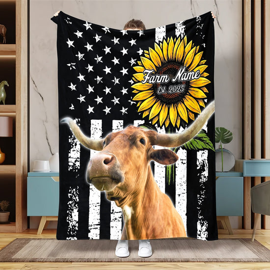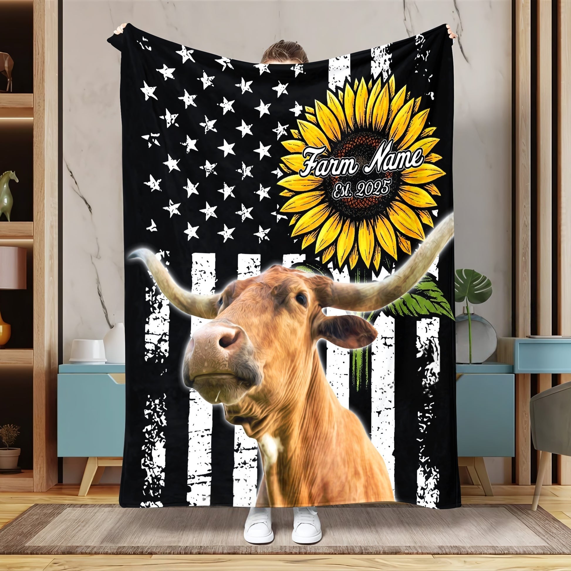 Joycorners Personalized Sunflowers & Cattle USA Flag Farm Blanket (10 Cattle Breeds)