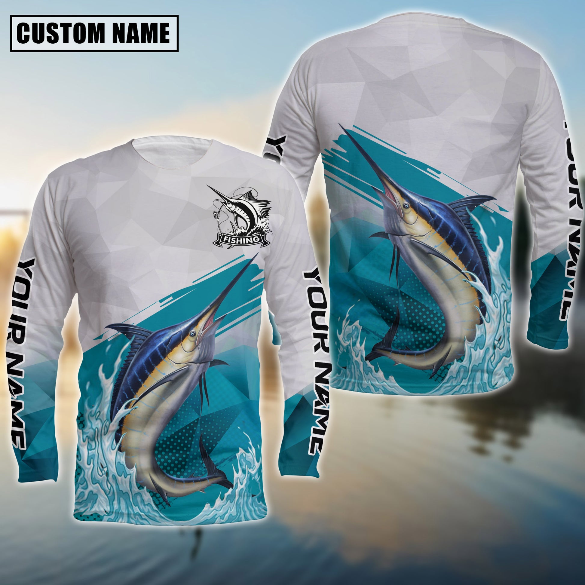 Joycorners Personalized Text Marlin Fishing Water & White 3D Long Sleeve Shirt