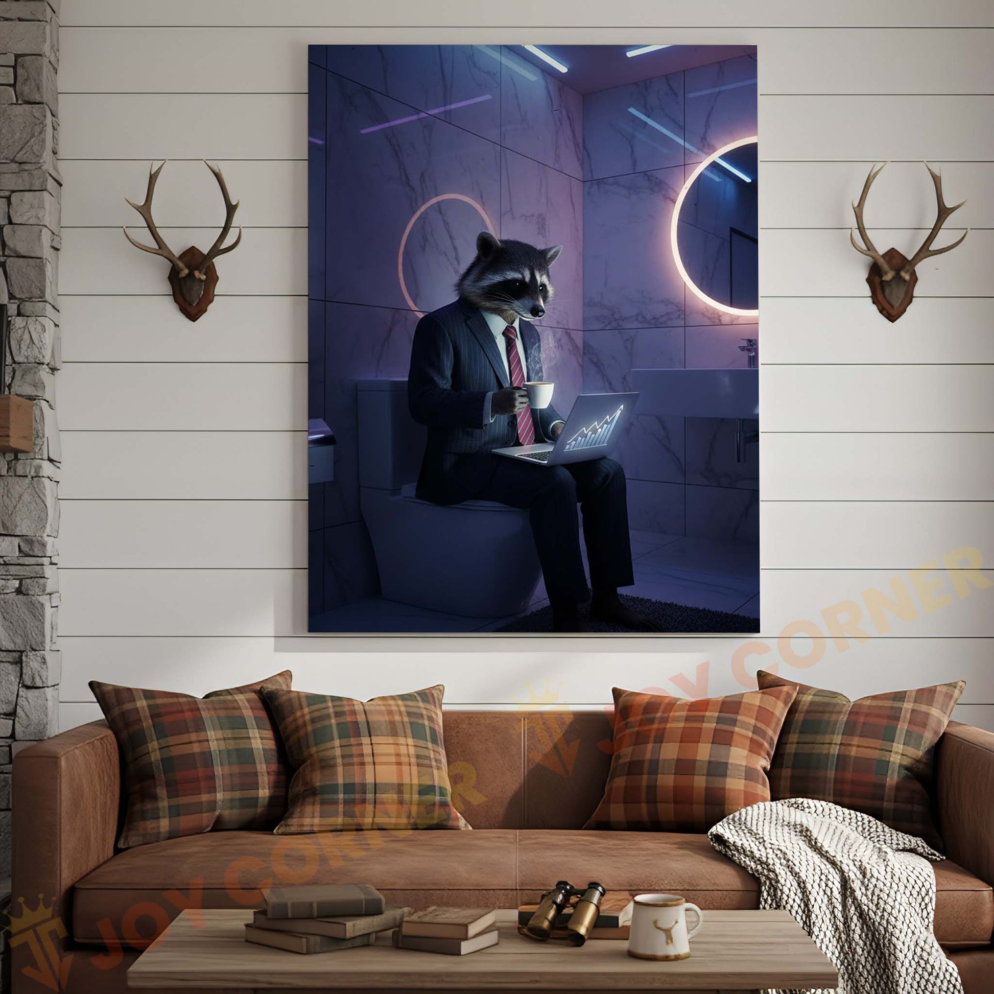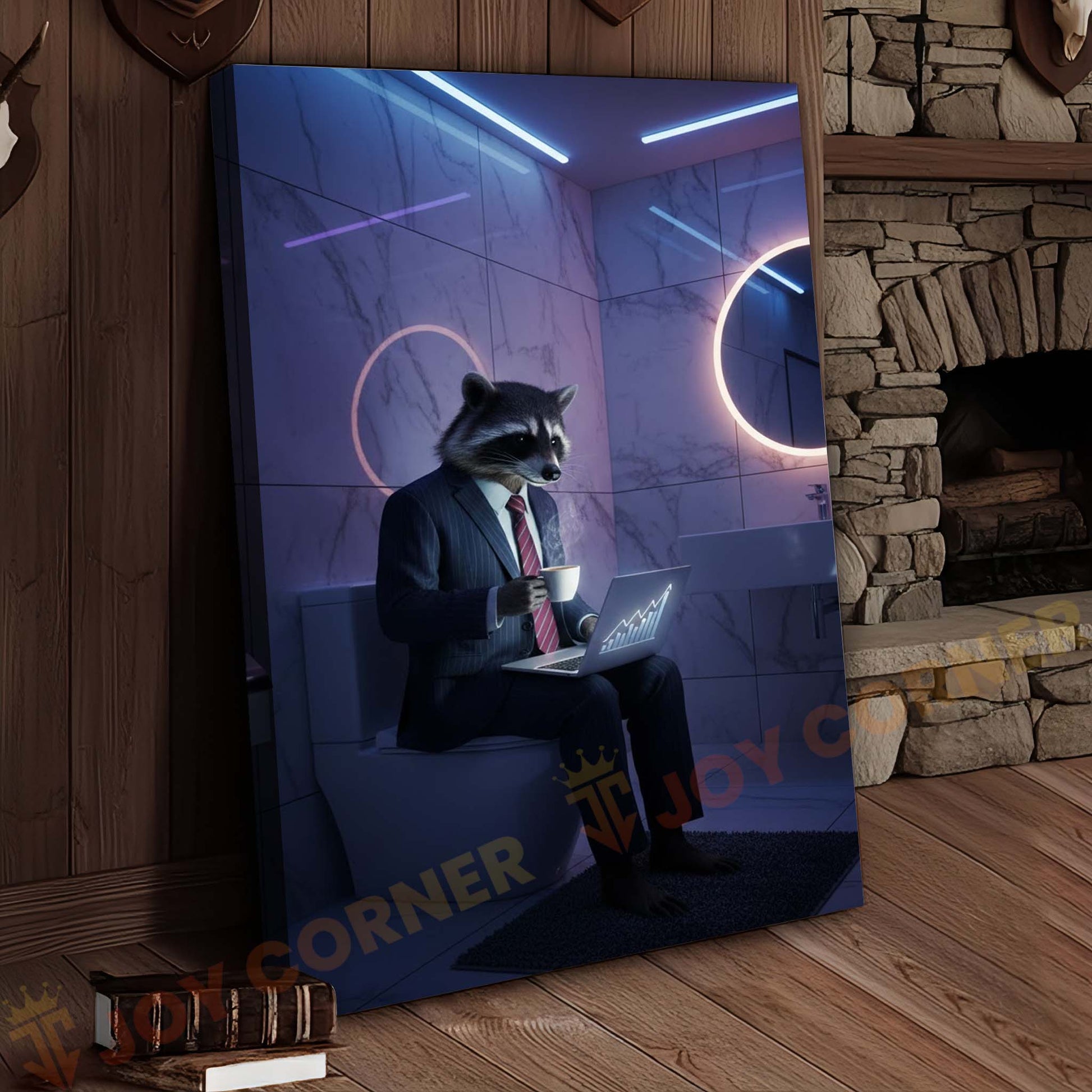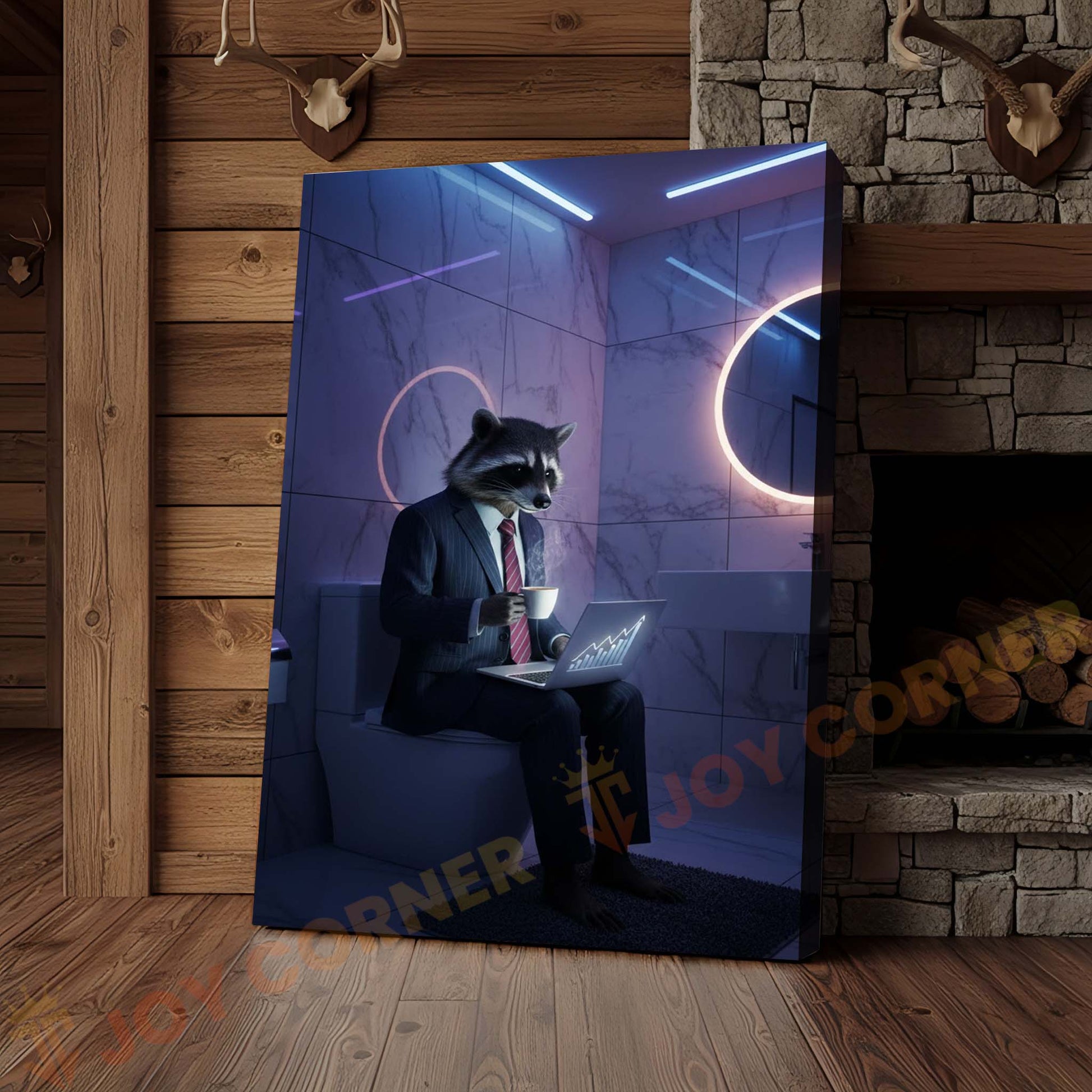 Joycorners Raccoon Working on Laptop in Bathroom Wrapped Canvas