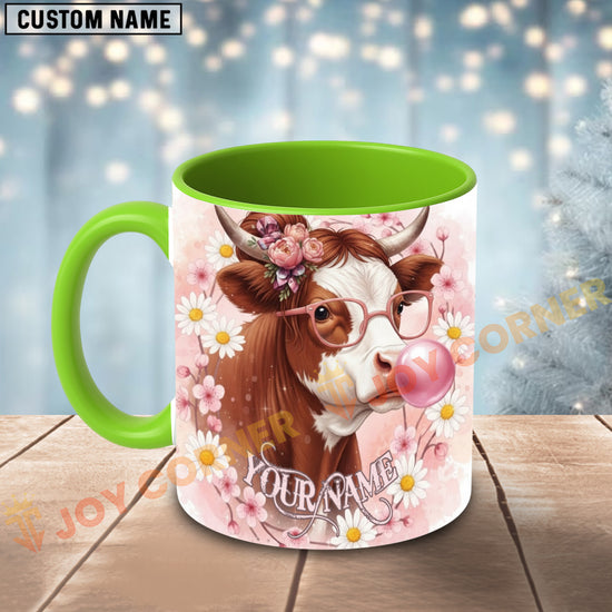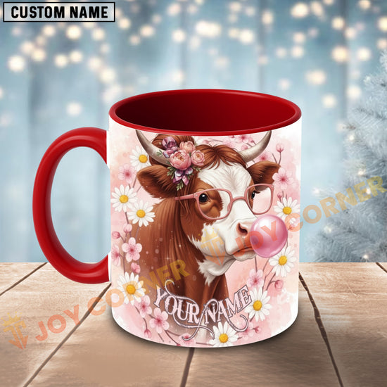 Joycorners Red and White Hereford Cow Bubblegum Flower Glasses Custom Name Mug