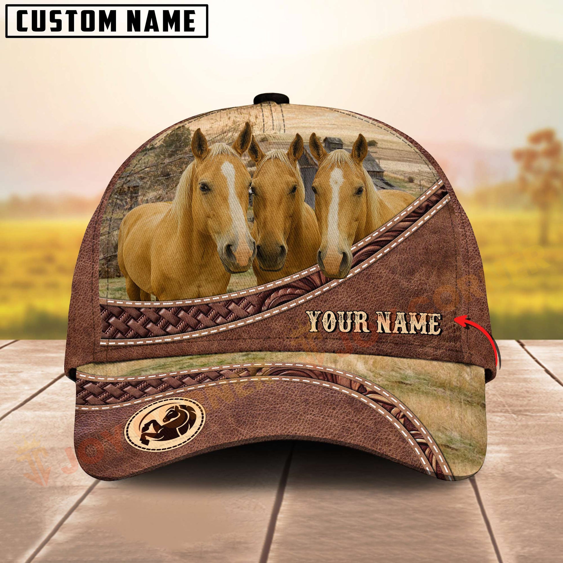 Joycorners Three Palomino Horse Tooled Leather Farm Landscape Pattern Personalized Name 3D Classic Cap