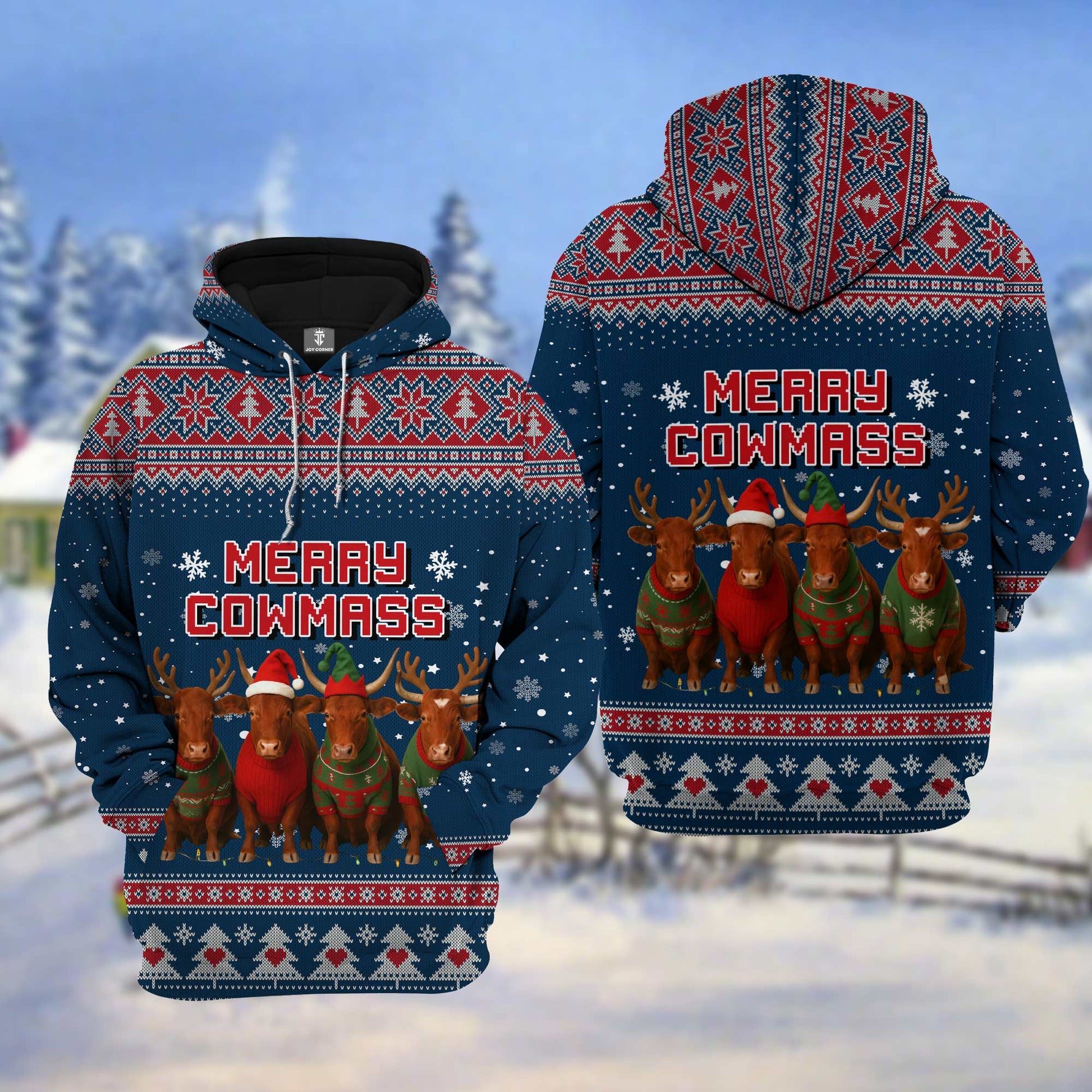 Joycorners Ugly Christmas Sweater Merry Christmas Cute Texas Longhorn Cow Overall 3D Hoodie