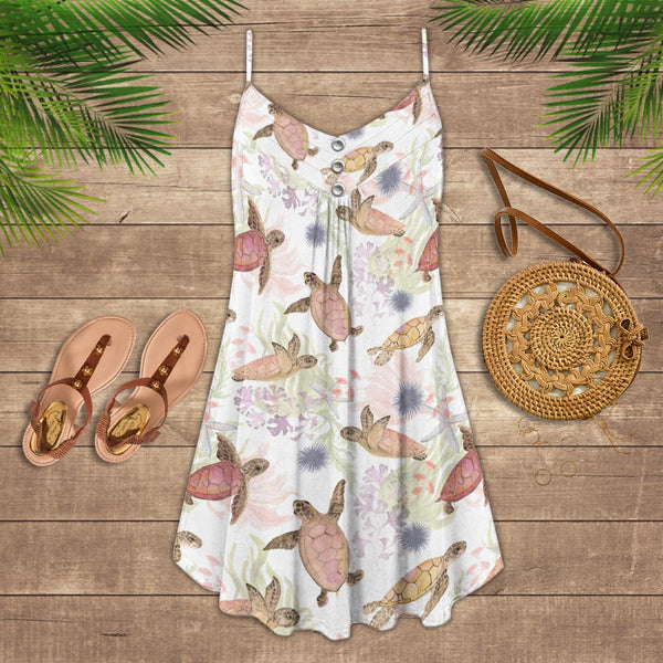 Joycorners White Pink Turtle Pattern All Printed 3D Spaghetti Strap Summer Dress