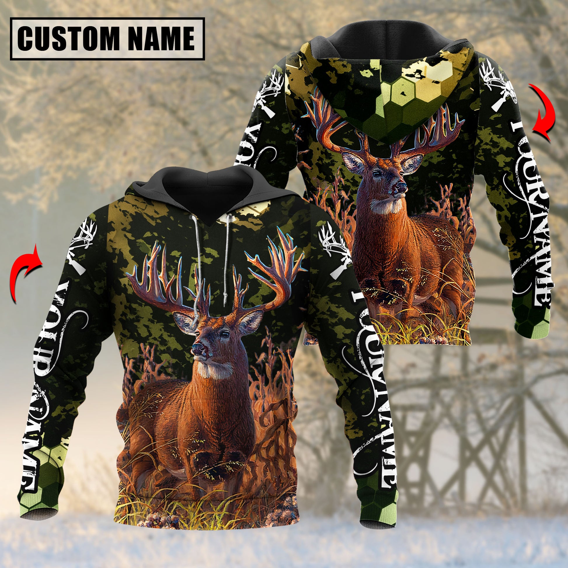Joycorners Whitetail Deer Hunting Personalized Name Green Camo 3D Hoodie