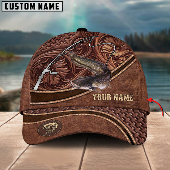 Joycornerss Custom Name Catfish Fishing Carving Leather Pattern 3D Classic Cap